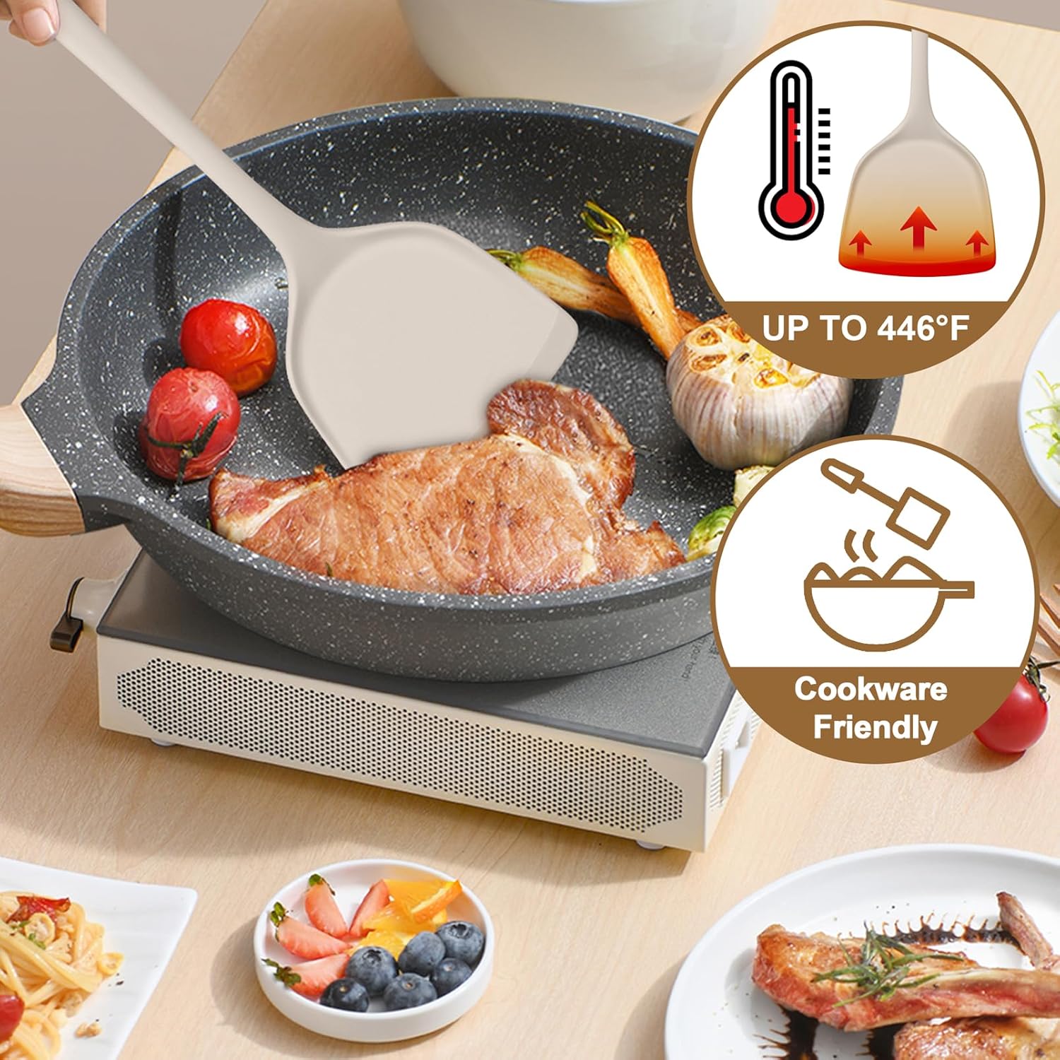 • NON SCRATCH & SEAMLESS: Smooth and soft silicone head design of the cooking utensils used for all non-stick cookware nicely, Protect the surface and leave no scratches and extend the using time of your cookware, With seamless construction, No worry about the top coming off or food trapped, A good substitution for two piece silicone utensil
