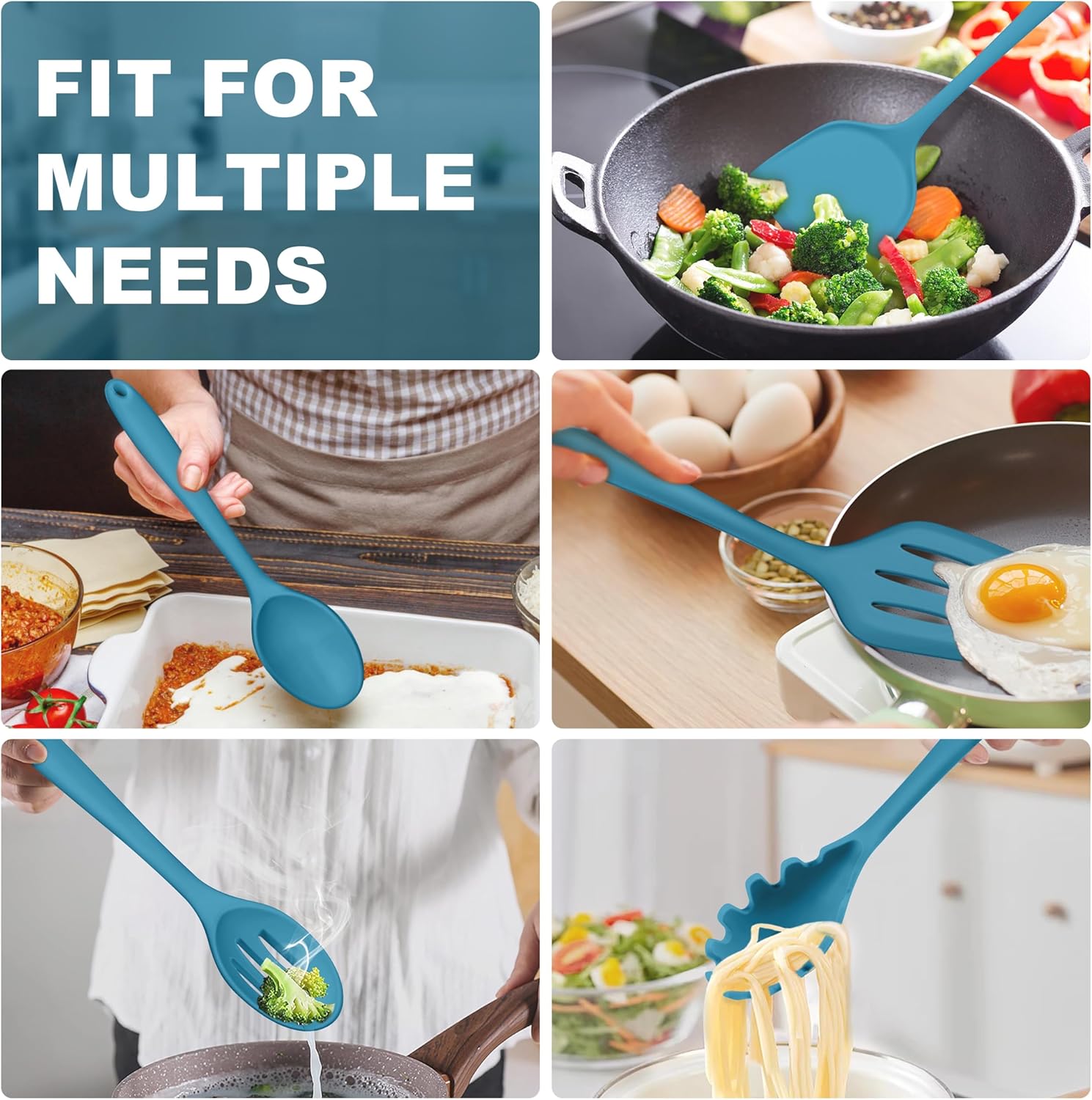 • 5 PIECE SET: Silicone cooking utensils set with different sizes and shapes for its’ various functions, Slotted and solid turner for frying, turning, flipping, Solid and slotted spoon for cooking, mixing, draining, Pasta Server for serving pasta, Great combination for cooking, Fit nicely for Housewarming / Thanksgiving / Birthday, etc.