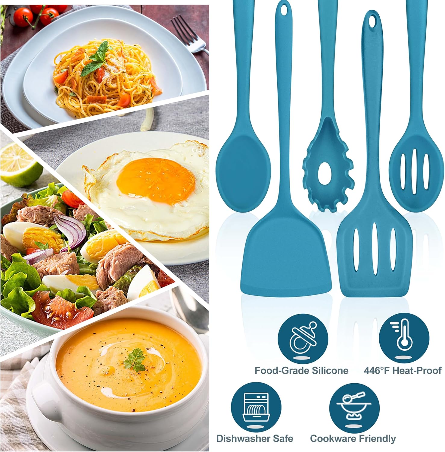• HEALTHY & HEAT-RESISTANT: The cooking utensils are made of healthy food grade silicone without harmful substances, Won’t release pungent smell and would not react with your foods, Withstand high temperature up to 446°F, Not easy to melt or burn when using in the high temp or boiling water, Safe and sturdy for daily cooking use