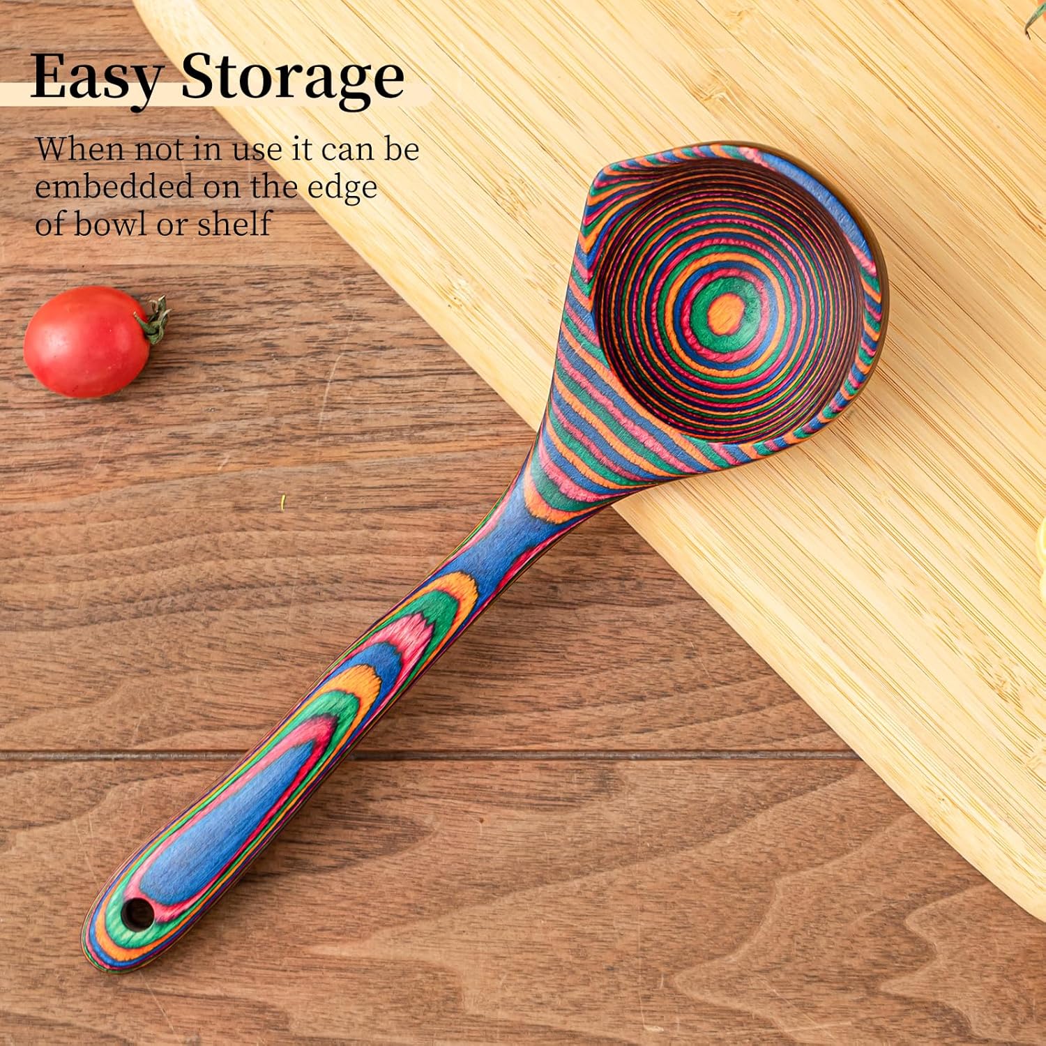 • Premium Pakkawood Rainbow Ladle with Spout: Pakkawood is also made of wood, color wood powder is molded through high-density insulation board process Texture and color can be controlled by craft