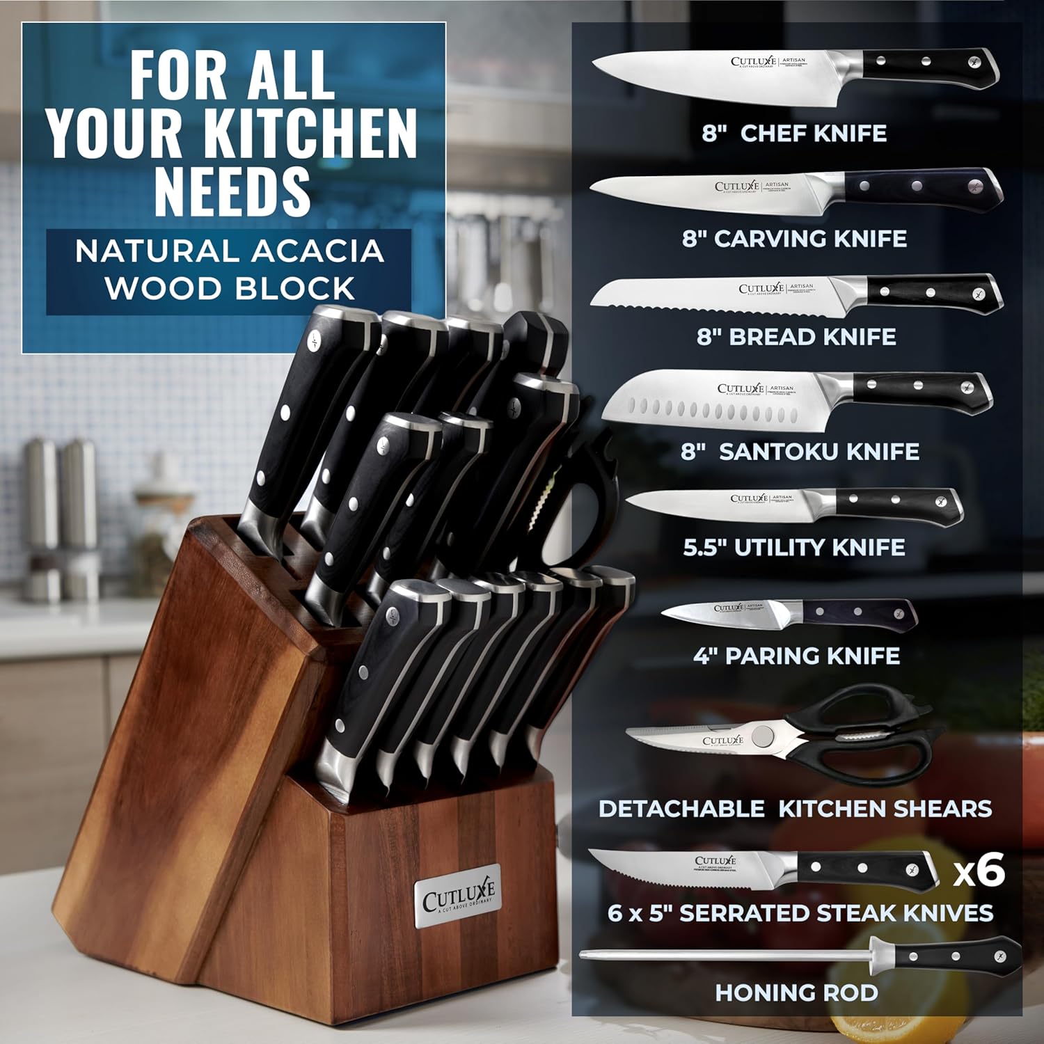 Cutluxe 15-Piece Knife Set – Premium Acacia Wood Block – Knife Set for Kitchen, Ultra Sharp High Carbon German Stainless Steel, Full Tang – Artisan Series