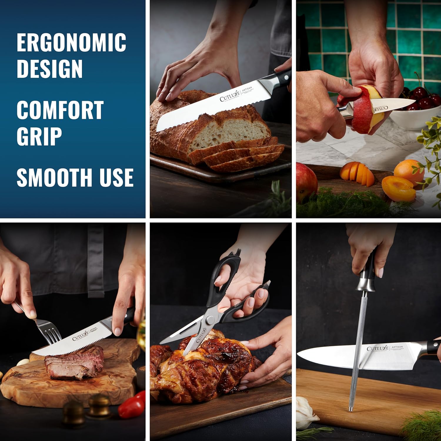 Cutluxe 15-Piece Knife Set – Premium Rubberwood Wood Block – Knife Set for Kitchen, Ultra Sharp High Carbon German Stainless Steel, Full Tang – Artisan Series