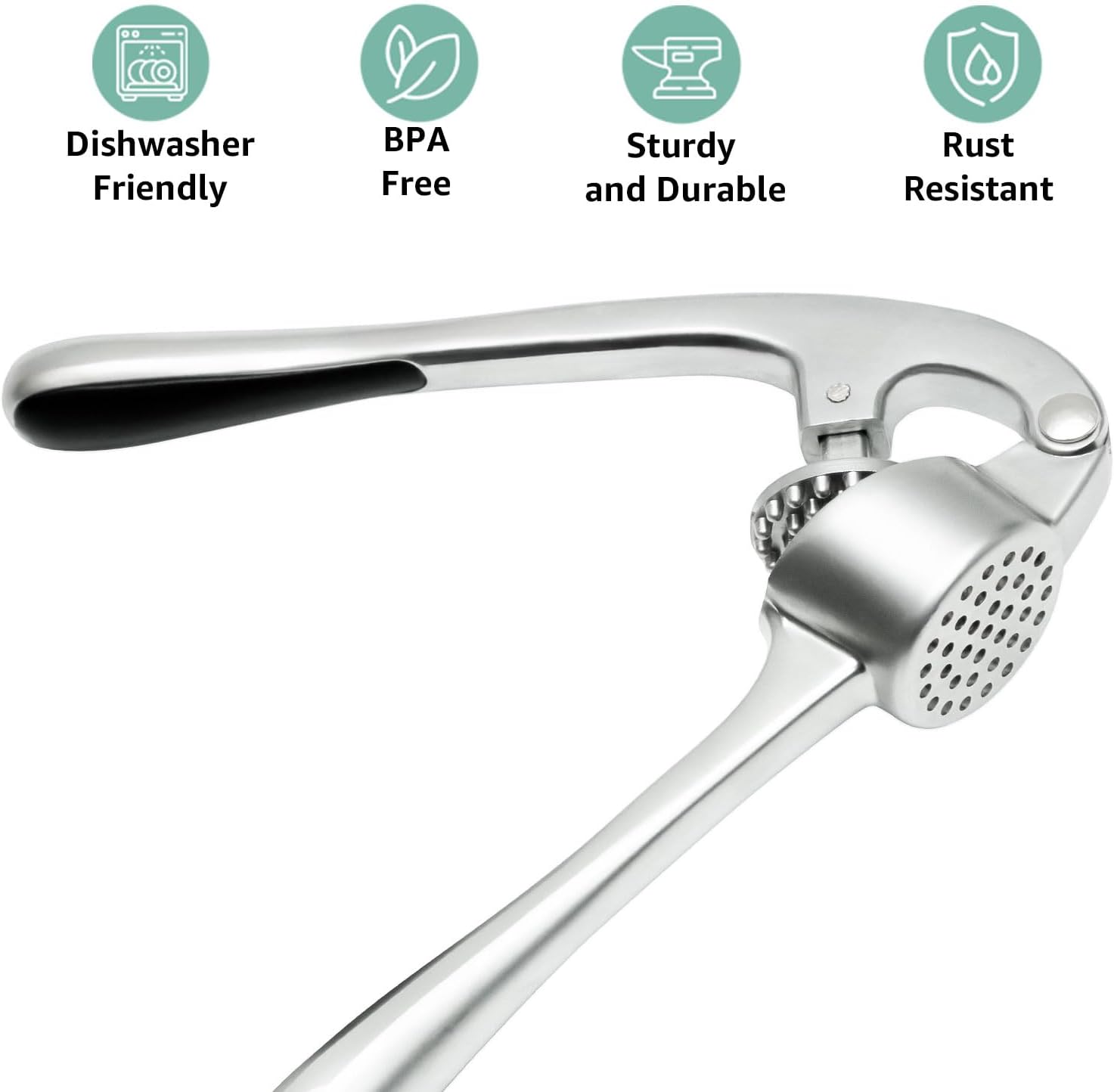 • ✅ Classic Silver Stainless Steel Build – Made from high-quality stainless steel, this garlic crusher press stainless steel tool is durable, rust-resistant, and built to last.