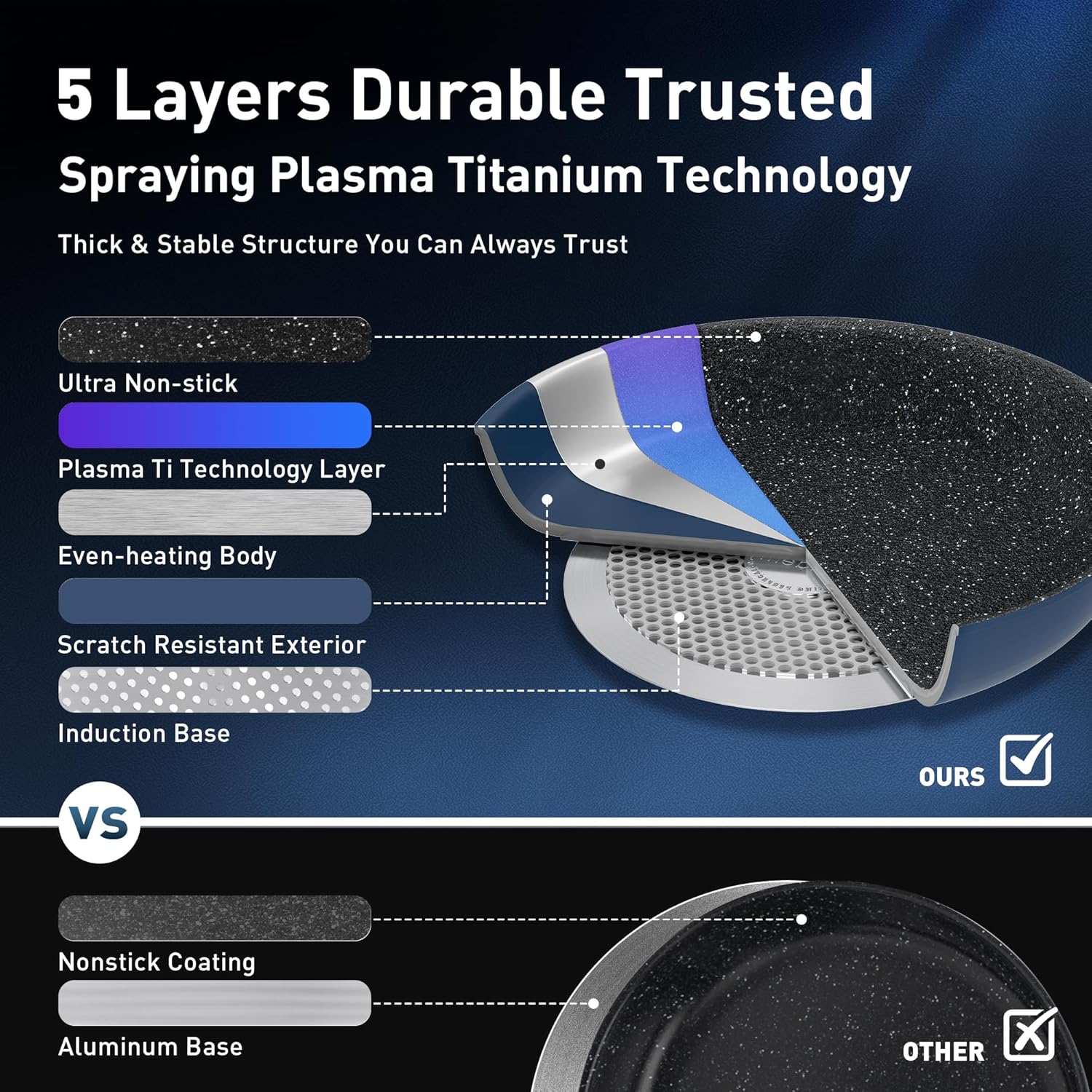 • 【Healthy Coating】: Non-stick cookware using plasma titanium and other high-tech composite material surface treatment, completely free of PFAS, PFOA, and other harmful substances, have better wear resistance and high temperature resistance performance