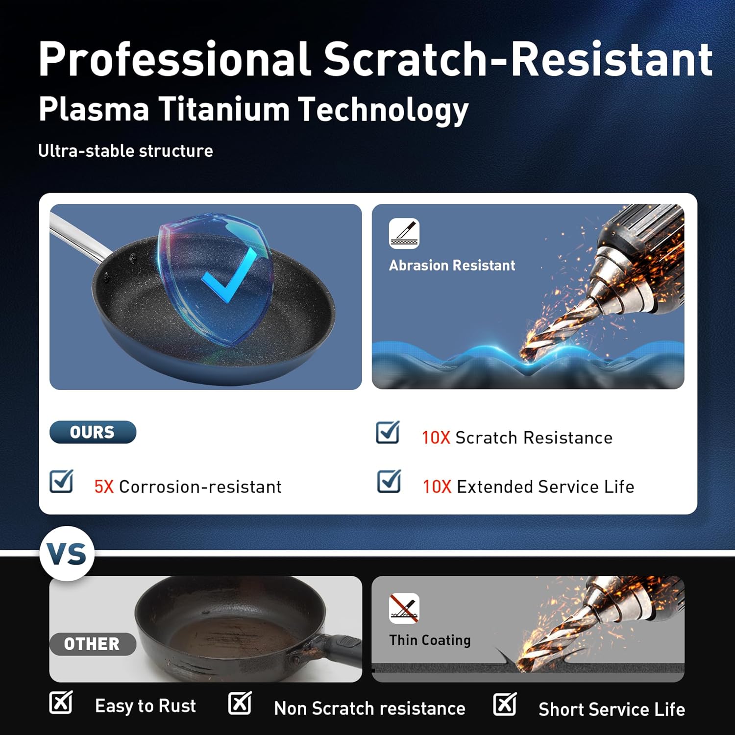 • 【Scratch-Resistant】: Titanium coating can withstand regular use and high temperatures without wearing off or losing its non-stick properties. Whatever cookware you use, we always recommend plastic, silicone, or wood utensils to prolong the lifespan of the cookware