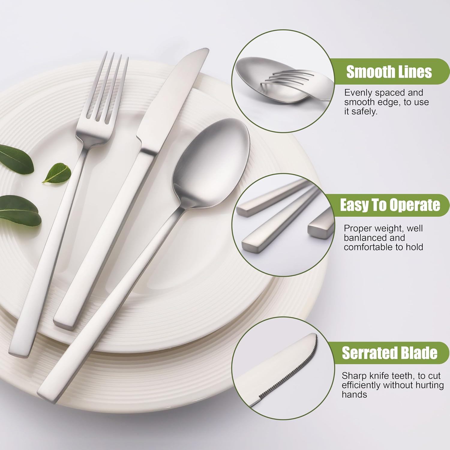 • 【Silverware Set For 8】The matte silverware set includes 8 of each: Dinner Knives, Dinner Forks, Dinner Spoons, Salad/Dessert Forks and Dessert/Tea Spoons. Ideal for everyday use, home, kitchen, restaurant serving and more.