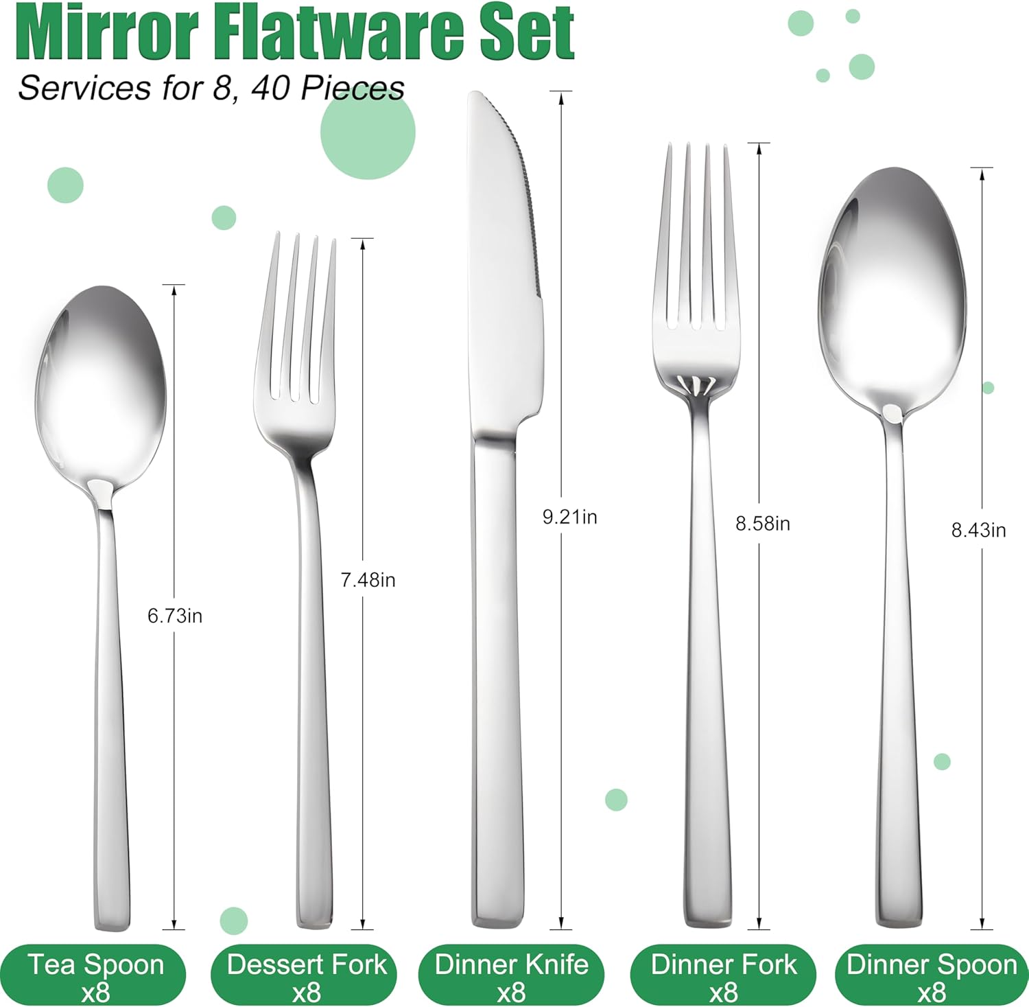 40-Piece Silverware Set Service for 8, Stainless Steel Cutlery Set, Mirror Polished Flatware Set, Kitchen Eating Tableware Set, Include Fork Knife Spoon, Dishwasher Safe