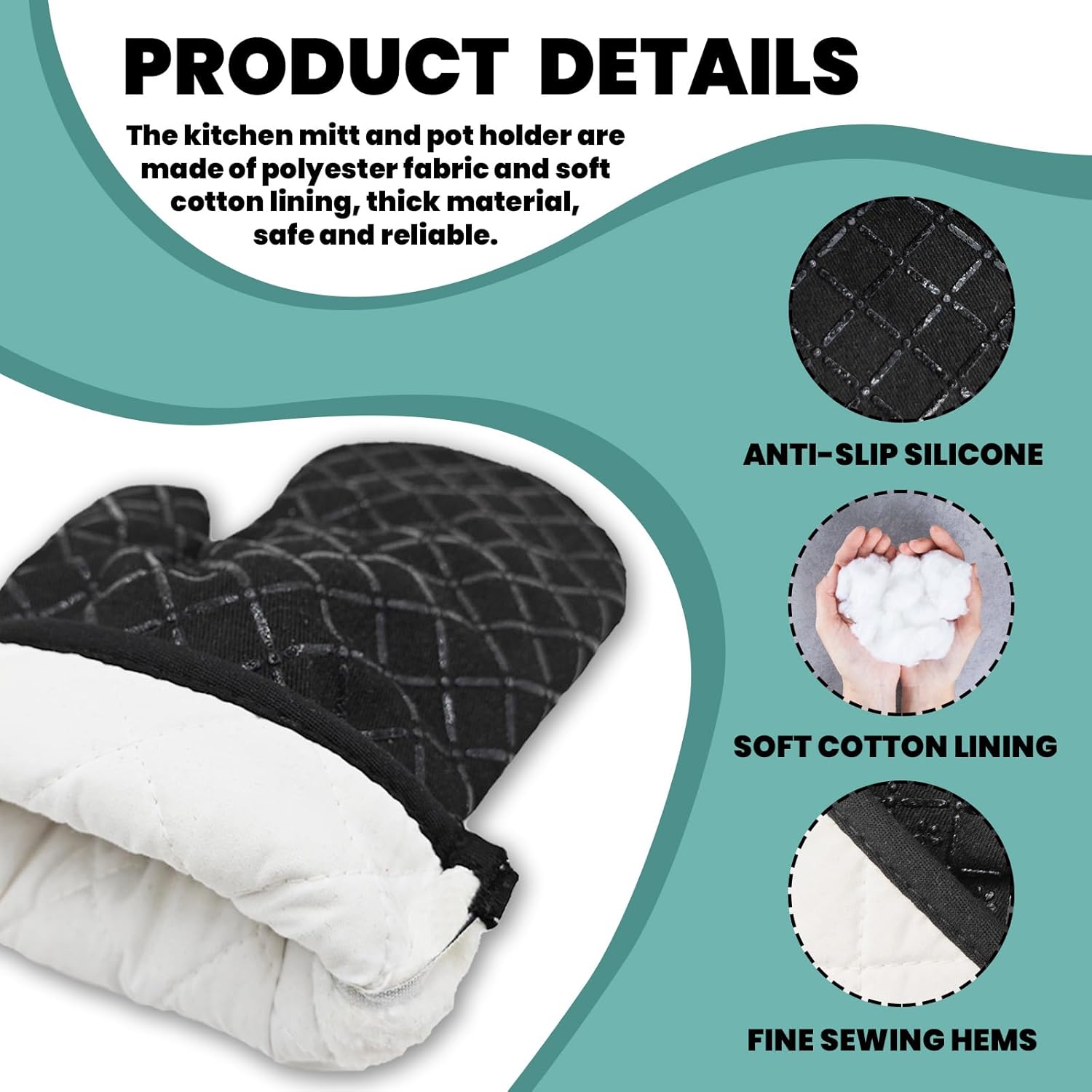 • Non-slip and Durable: The oven mitts and pot holders are designed with silicone, which can improve control and stability when moving or holding pots and pans, making you safer.