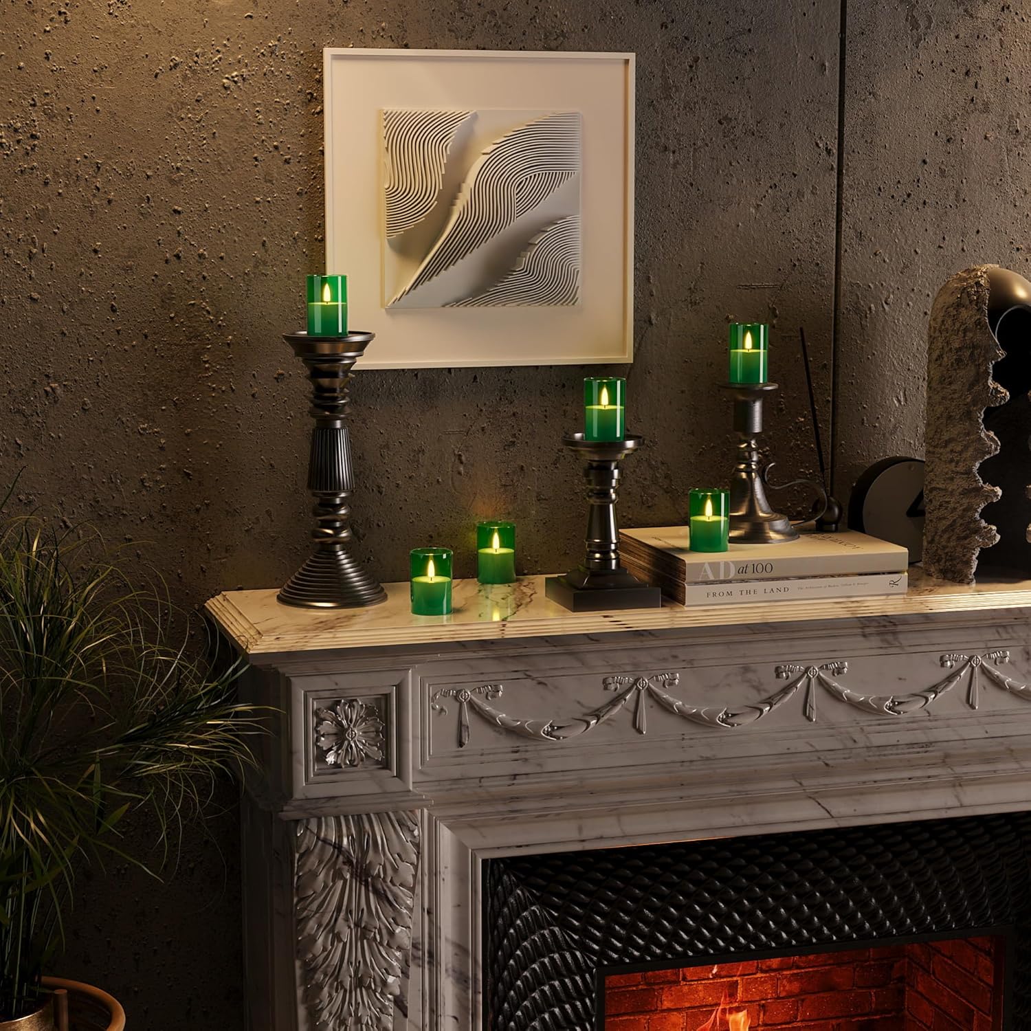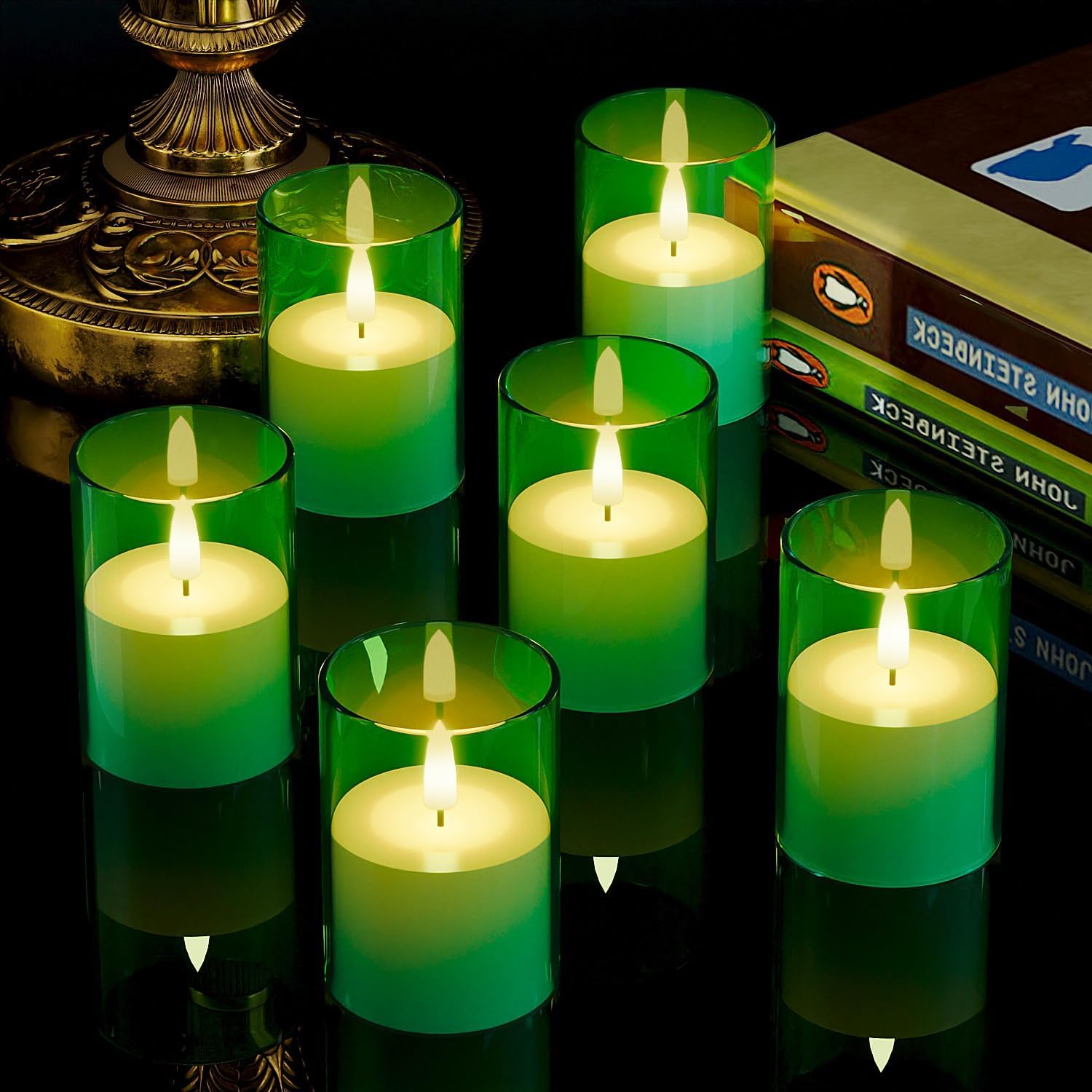 6Pack Flickering Flameless LED Candles with Timer, Battery Powered - Small Pillar & Votive, Green (2"X3")