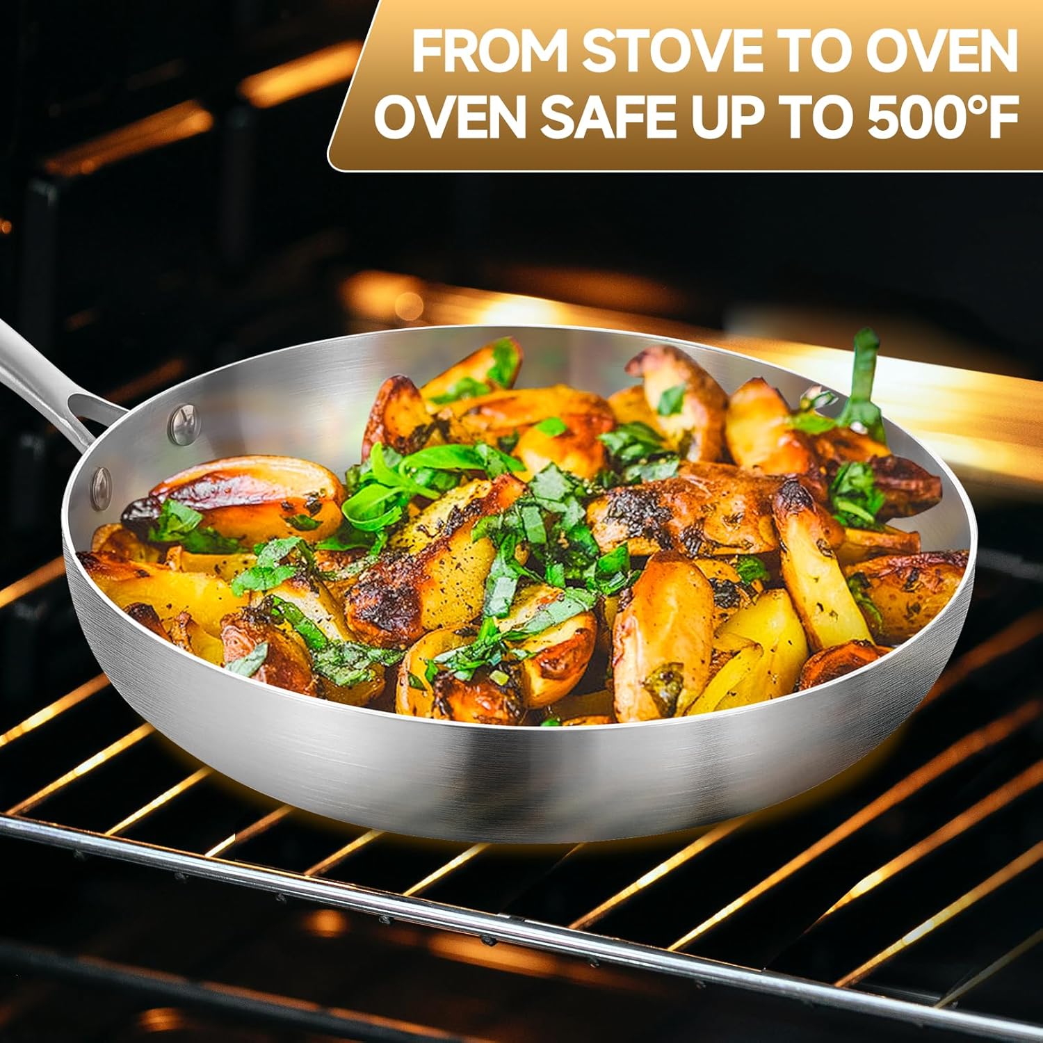 • Triple-Ply Construction for Fast Heating & Energy Efficiency: This stainless steel pan features a premium triple-ply base (stainless steel-aluminum-stainless steel) for rapid, even heat distribution. Retains heat effectively for consistent cooking results while reducing energy consumption, perfect for searing, frying, and simmering