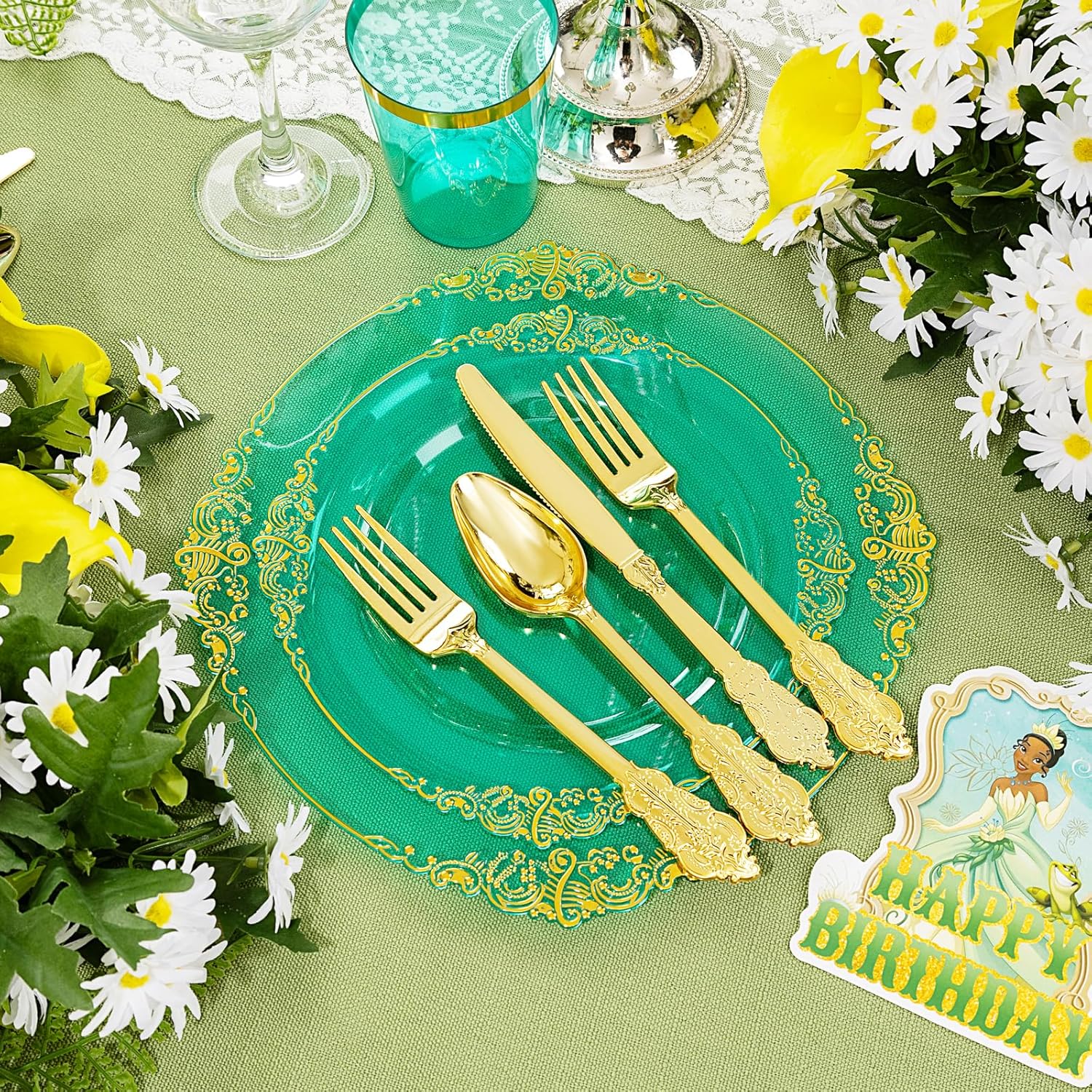 • EXQUISITE DESIGN: These Clear Green Plastic Plates feature an elegant vintage design and are handled through strict quality control, making gold disposable plates much stronger than regular ones. The gold plastic plates match perfectly with fancy tableware, cups, and napkins, ensuring your guests are fully satisfied.