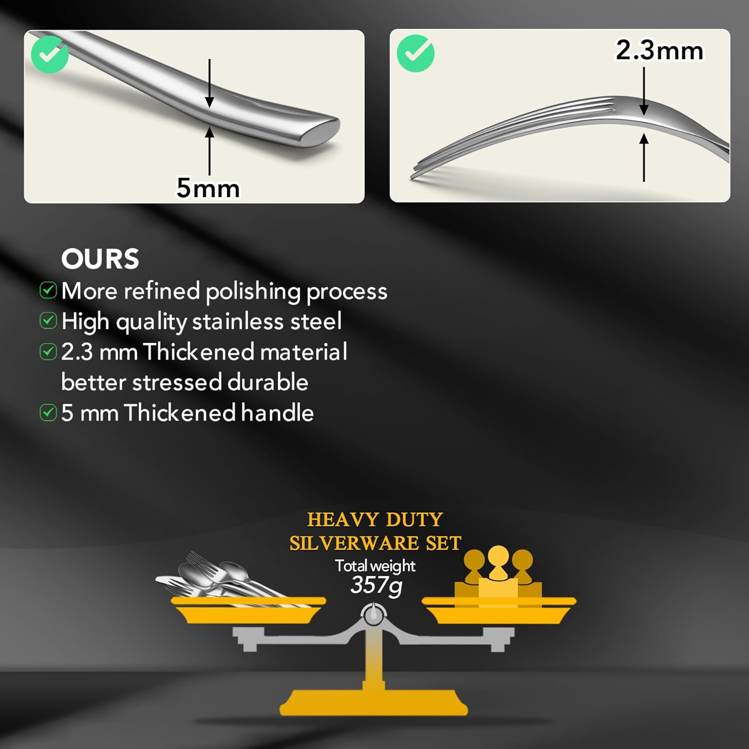• 【Stainless Steel Silverware Set Heavy Weight】The forks and spoons silverware set is approximately 2 times thicker than a regular cutlery sets. More solid construction ensures everyday usage and durability, no worry about bending. The weighted silverware is made of high-quality stainless steel, which has great anti-corrosion and rust resistance to ensure eating health. Enjoy the benefits of stunning and reliable utensil sets for years to come