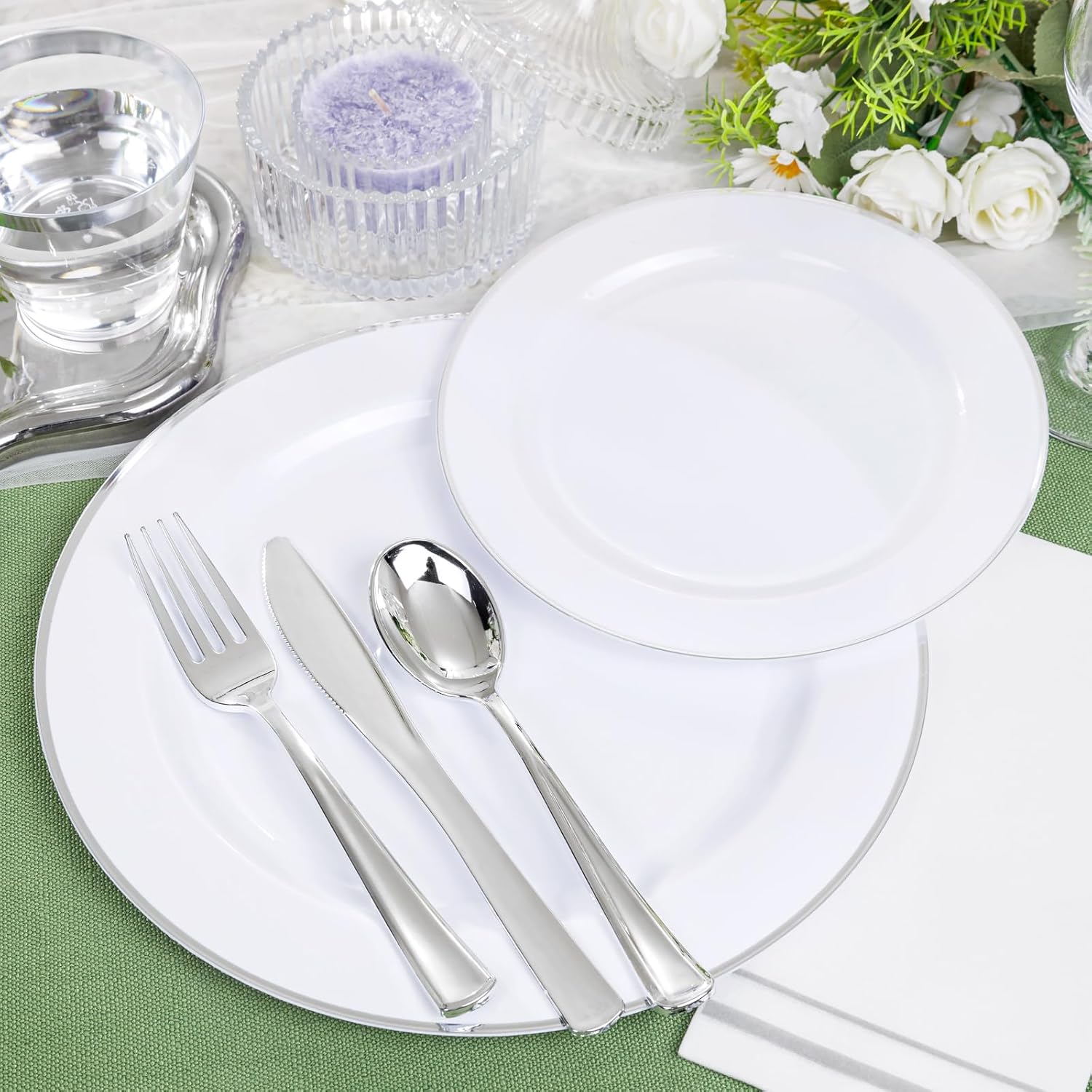 SUT 175 Piece Silver and White Plastic Dinnerware Set for 25 Guests, Disposable Plastic Plates, Include: 25 Dinner Plates, 25 Dessert Plates, 25 Pre Rolled Napkins with Silver Silverware, 25 Cups