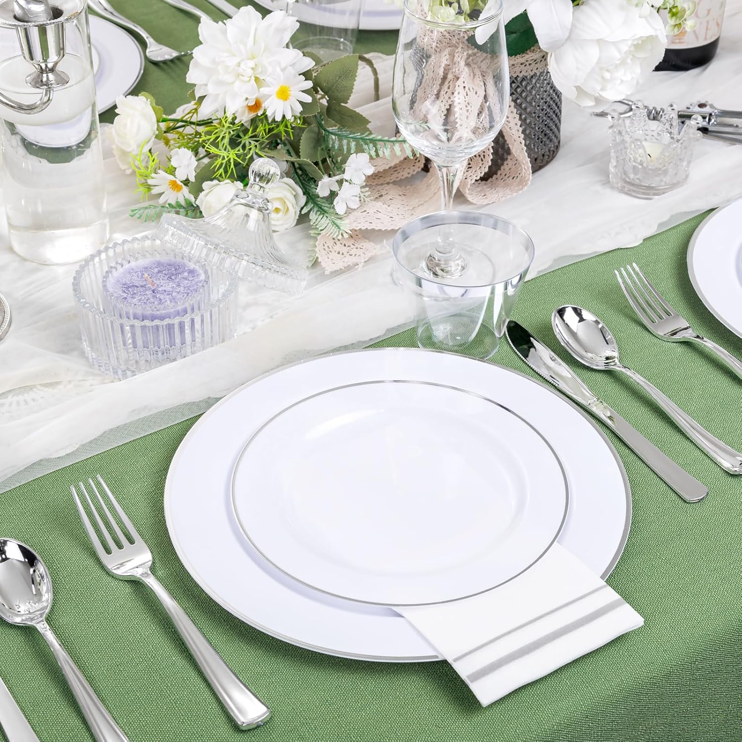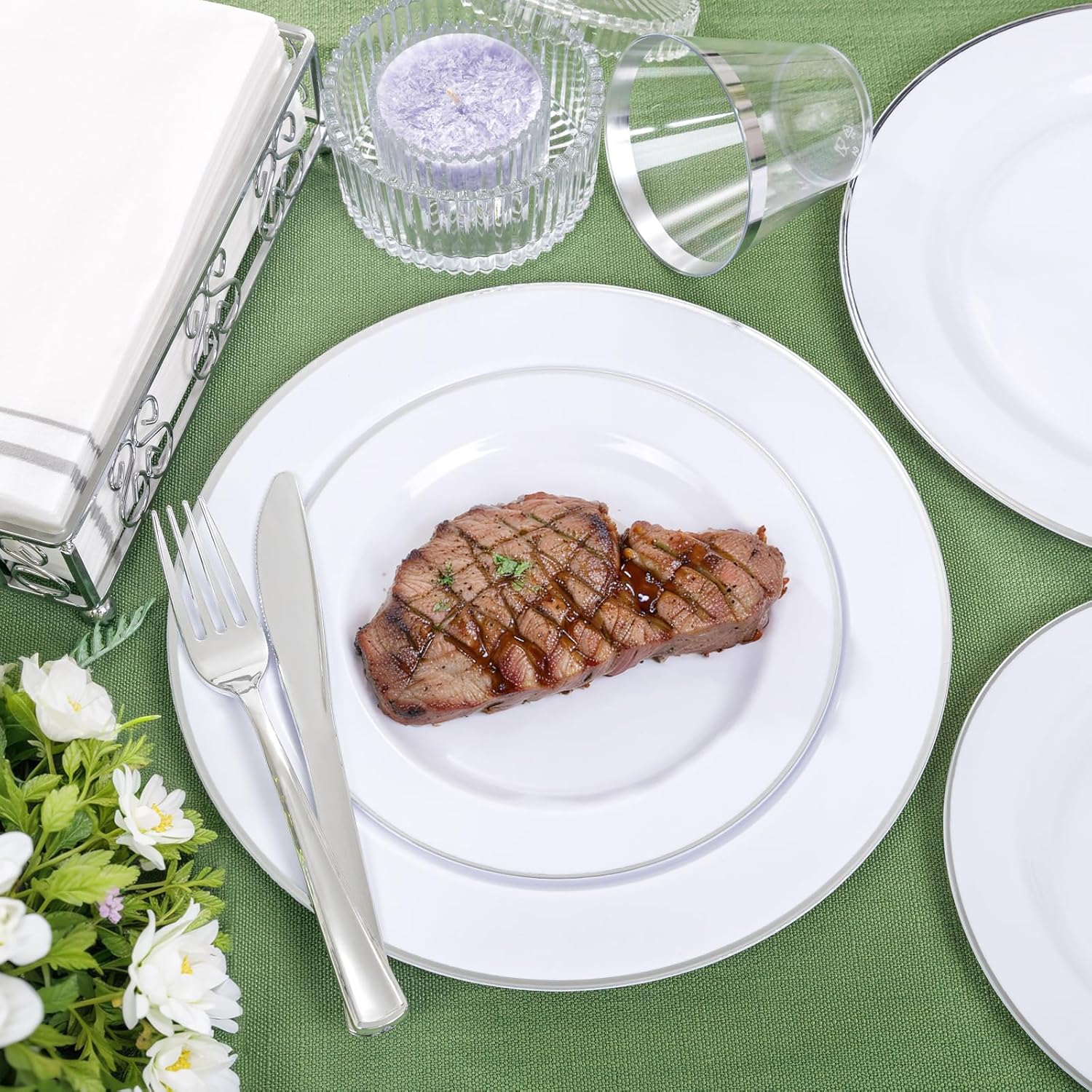 • WHAT YOU GET: 175pcs white plates disposable for 25 guests, Include: 25 dinner Plates, 25 dessert Plates, 25 napkins,25 silver silverware, 25 Cups. It is great party plates.