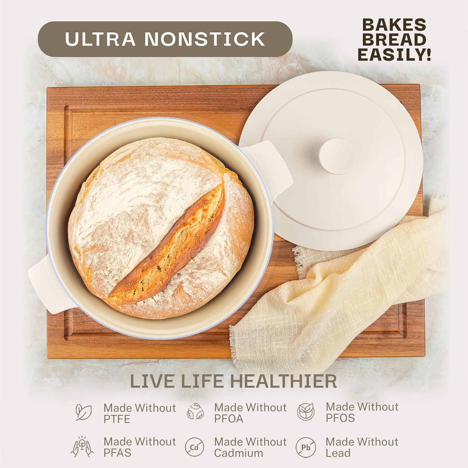 • NON TOXIC: This Ceramic Dutch Oven is free of PFOA, PFOS & other harmful chemicals including lead & cadmium, allowing you and your family to Keep a healthy, toxin free, and ecofriendly cooking environment.