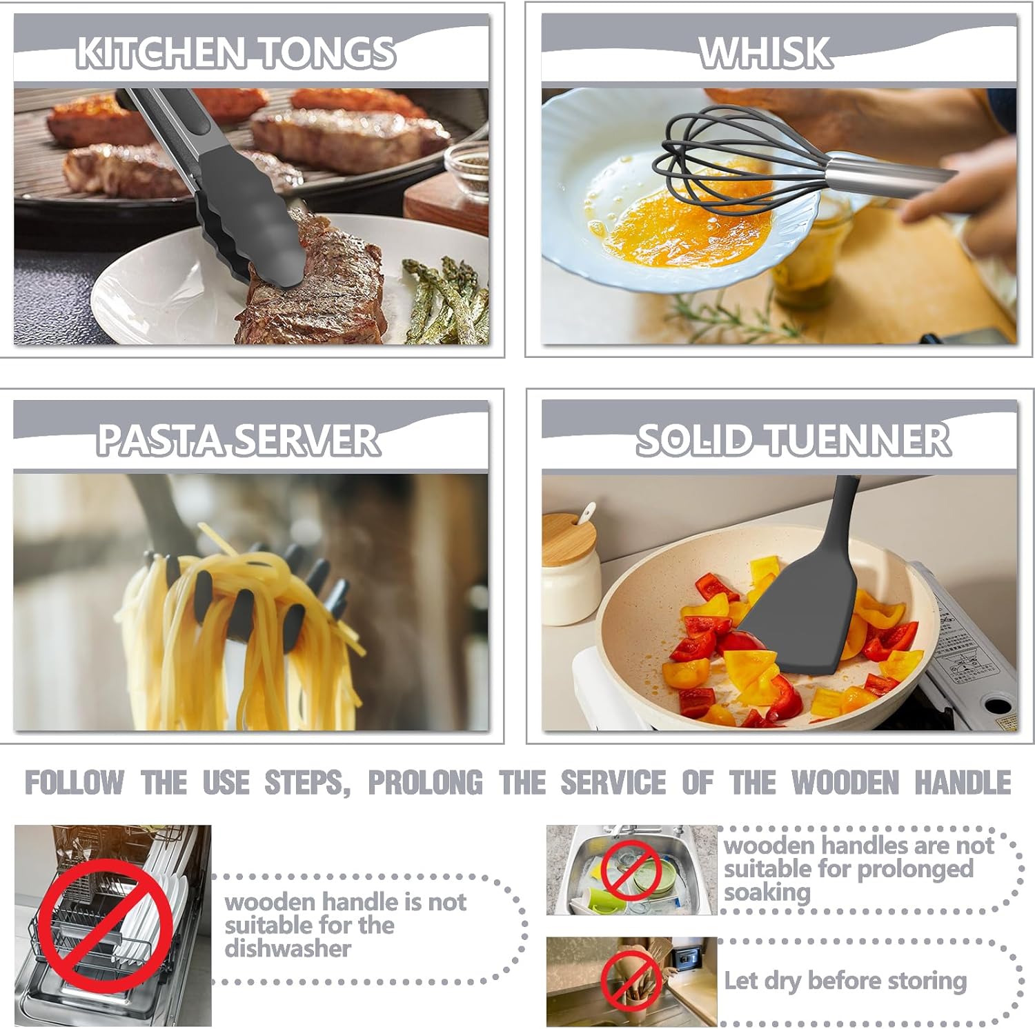 Umite Chef Silicone Kitchen Utensil Set, 34PCS Heat Resistant Kitchen Gadgets and Tools With Grater, Wood Handles for Nonstick Cookware (Dark Gray)