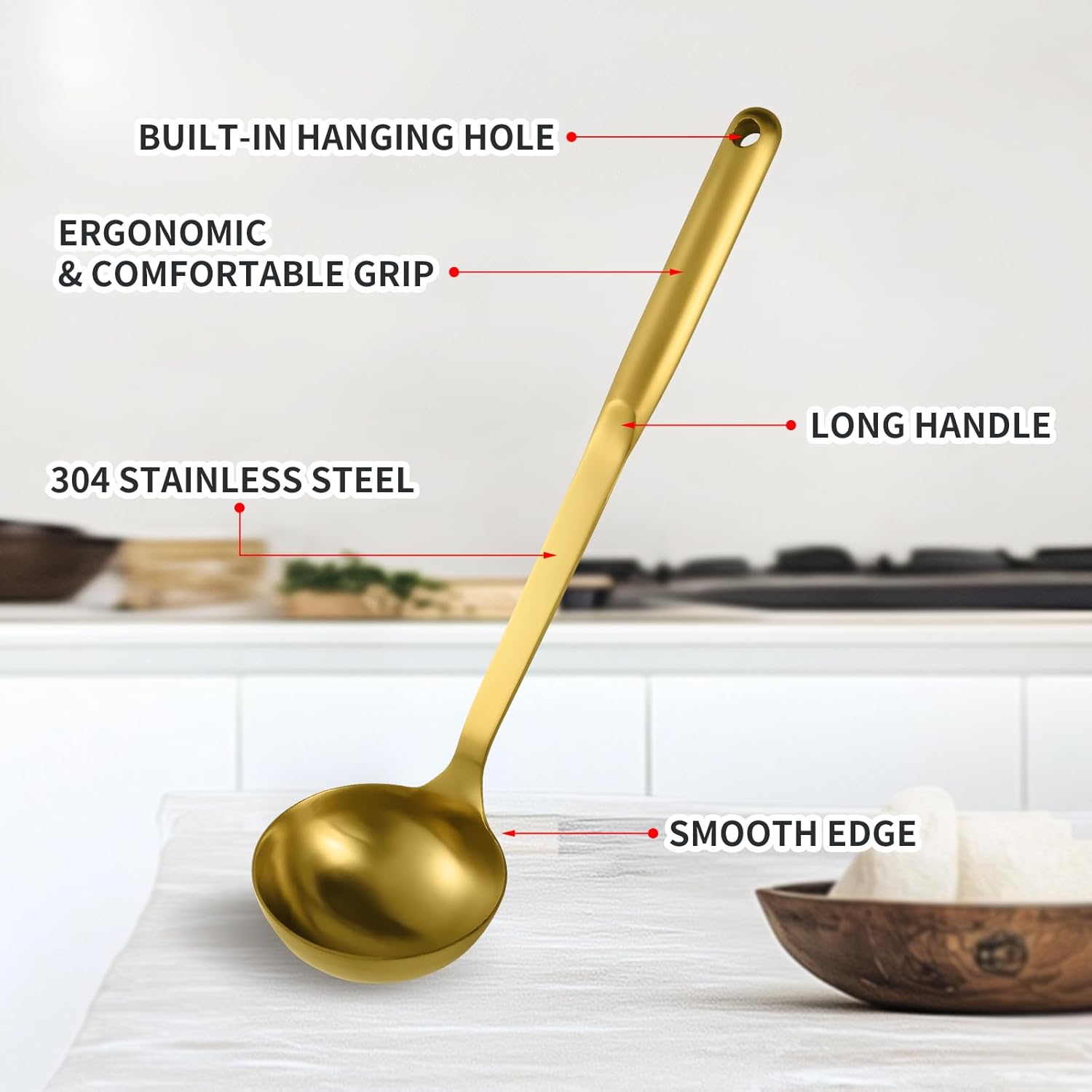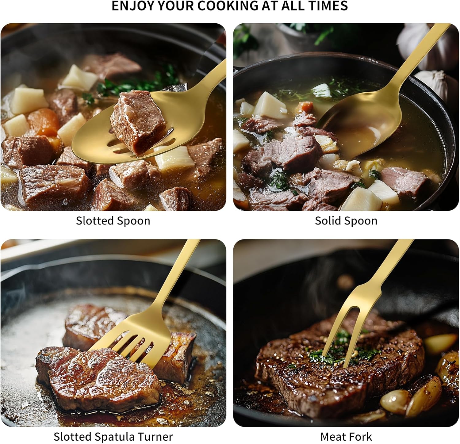 304 Stainless Steel Cooking Utensils Set, 8PCS Kitchen Utensils Set, Include Skimmer, Soup Ladle, Spaghetti Server, Wok Spatula, Slotted Spoon, Solid Spoon, Slotted Spatula Turner & Meat Fork, Gold
