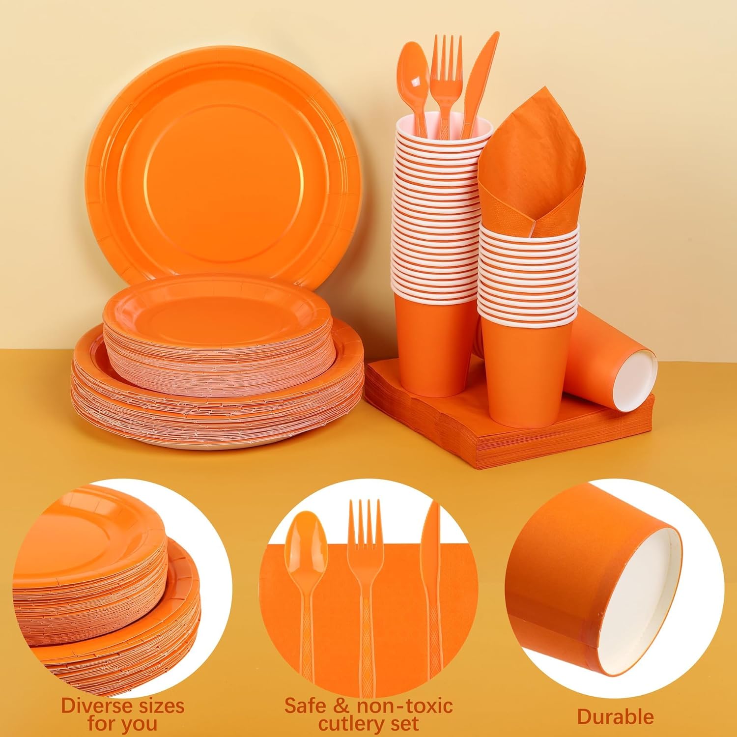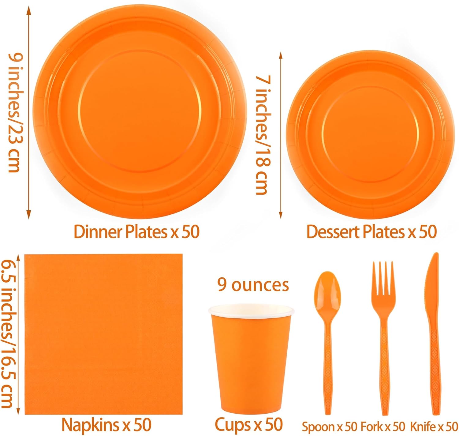• Set includes: 350 pieces of orange paper plates and napkins: 50 9-ounce (250ml) paper cups, 50 7-inch paper trays, 50 9-inch paper trays, and 50 napkins; the plate set can accommodate 50 guests