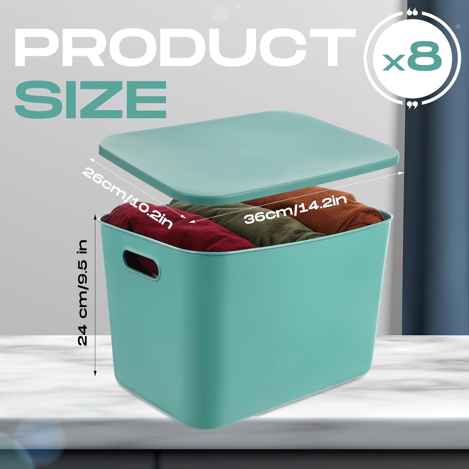 Hoolerry 8 Pieces Colorful Storage Bins with Lid, Plastic Storage Basket Organizing Container Stackable Box with Handle for Shelves Desktop Playroom Office(14.2 x 10.2 x 9.5 Inch,Green and Yellow)
