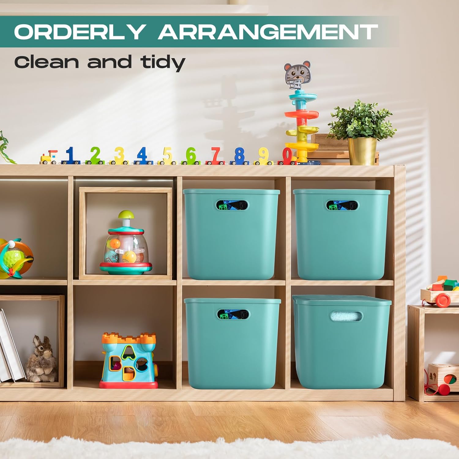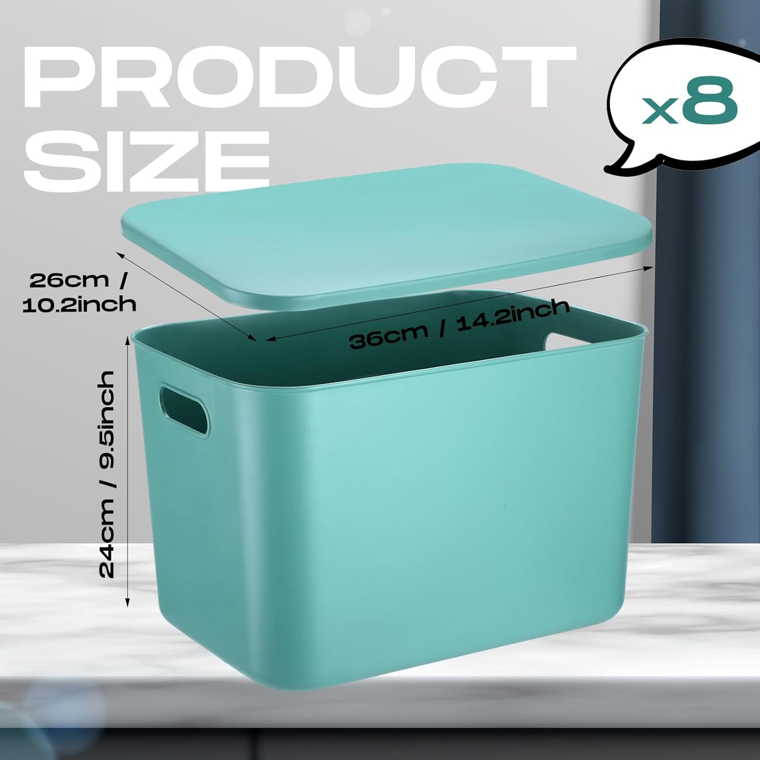 Hoolerry 8 Pieces Colorful Storage Bins with Lid, Plastic Storage Basket Organizing Container Stackable Box with Handle for Shelves Desktop Playroom Office(14.2 x 10.2 x 9.5 Inch,Green)