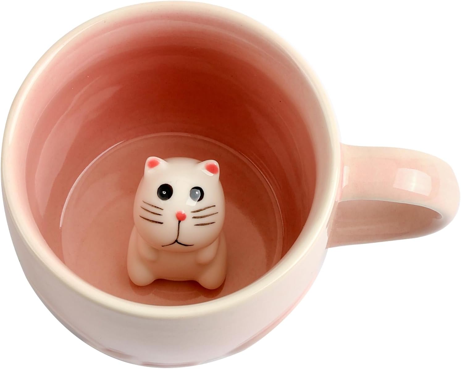 Cat Ceramic Cup Hidden 3D Animal Inside Mug,Cute Cartoon Handmade Figurine Mug,Christmas Birthday Surprise for Friends Family or Kids (Pink Cat)