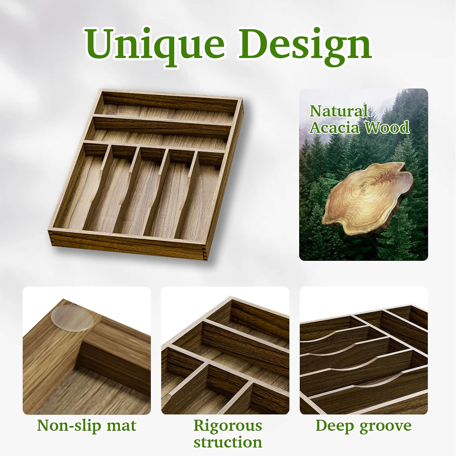 • 𝐍𝐚𝐭𝐮𝐫𝐚𝐥 𝐀𝐜𝐚𝐜𝐢𝐚 𝐖𝐨𝐨𝐝-Made of acacia wood, this silverware drawer organizer is very attractive, well made and easy to clean. More resistant than plastic and other materials. The color of natural wood is so beautiful and rich.