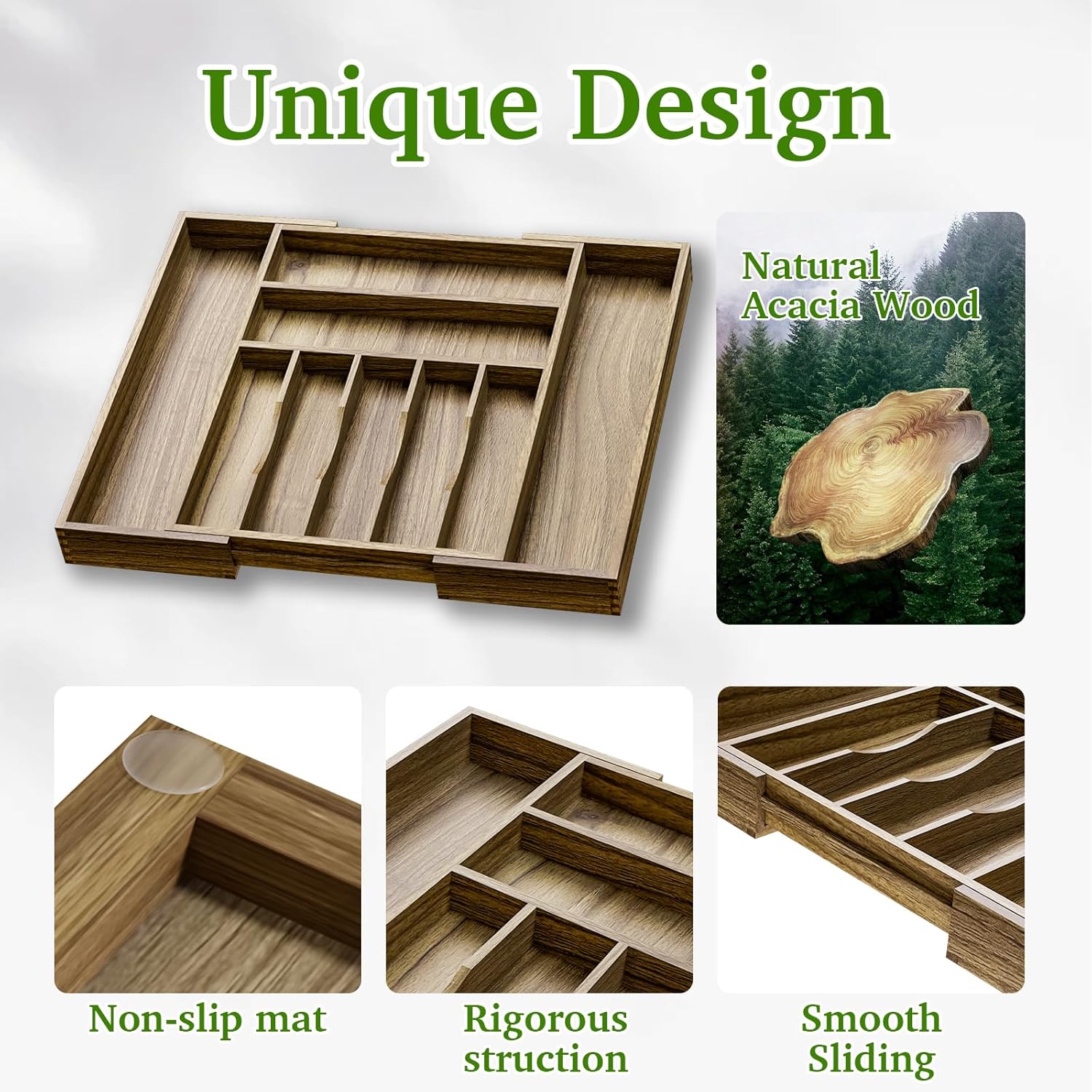 • 𝐍𝐚𝐭𝐮𝐫𝐚𝐥 𝐀𝐜𝐚𝐜𝐢𝐚 𝐖𝐨𝐨𝐝-Made of acacia wood, this silverware drawer organizer is very attractive, well made and easy to clean. More resistant than plastic and other materials. The color of natural wood is so beautiful and rich.