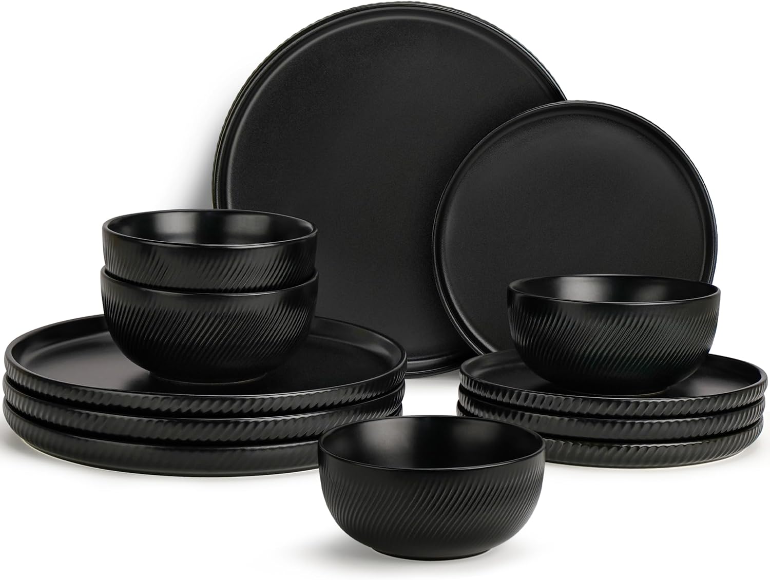 Matte Black Plates and Bowls Set 12pcs, Stoneware Dinnerware Sets for 4, Dishwasher and Microwave Safe Ceramic Dishes Set, Ribbed, Obsidian Night