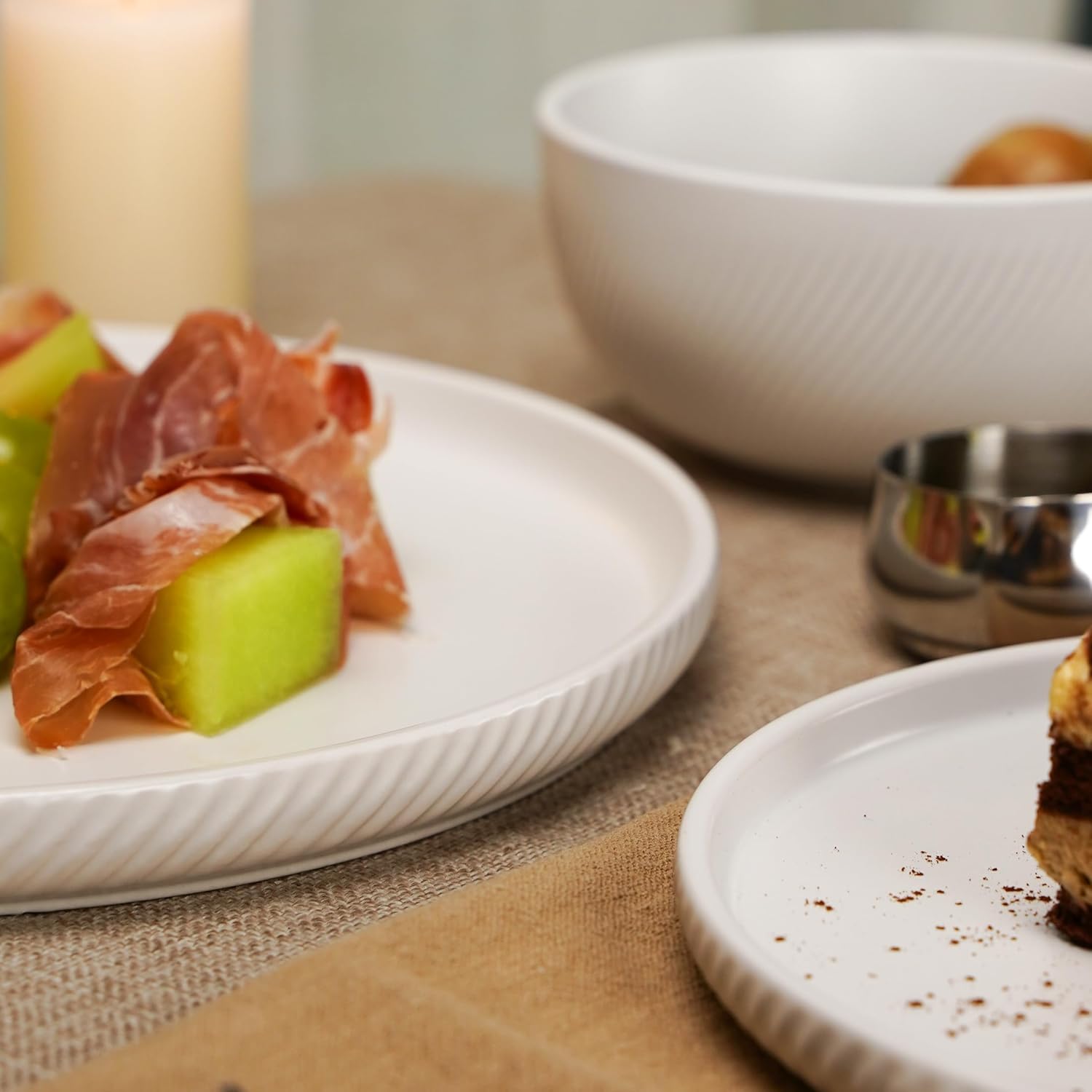 Earthsong Dinnerware Sets for 4, 12-Piece Ceramic Plates and Bowls Set, Dishwasher and Microwave Safe Stoneware Dishes Set, Ribbed, Snowcrest White