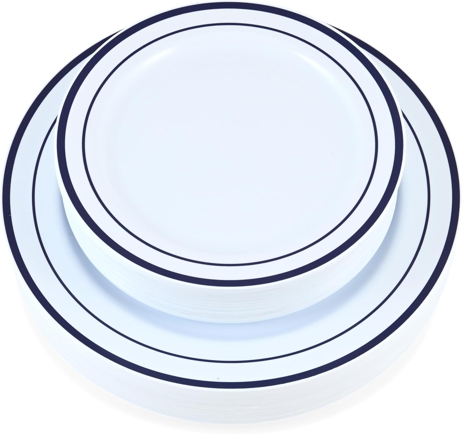 60 Pieces White Plastic Disposable Plates - Premium Heavy-Duty 30 Dinner Plates & 30 Salad Plates with Navy Rim Ideal for Party, Birthday and Special Events