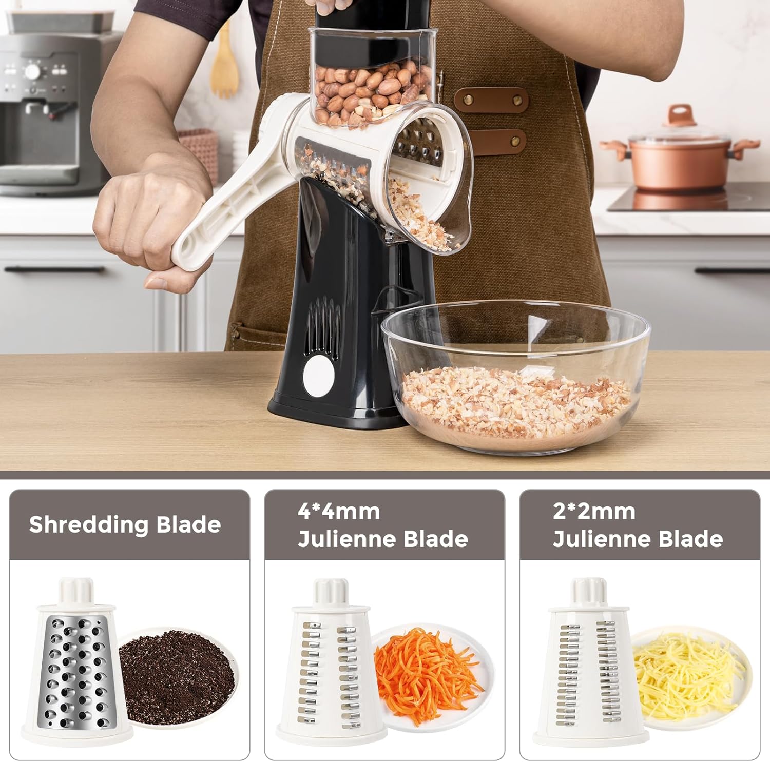 • Versatile Kitchen Companion: The cheese grater is equipped with five interchangeable drum blades including slicing, wave, shredding, and two julienne blades, making ingredient prep easier. The rotary cheese grater is ideal for grating cheese, vegetables, cookies, nuts, chocolate, and more, effortlessly handling your culinary tasks