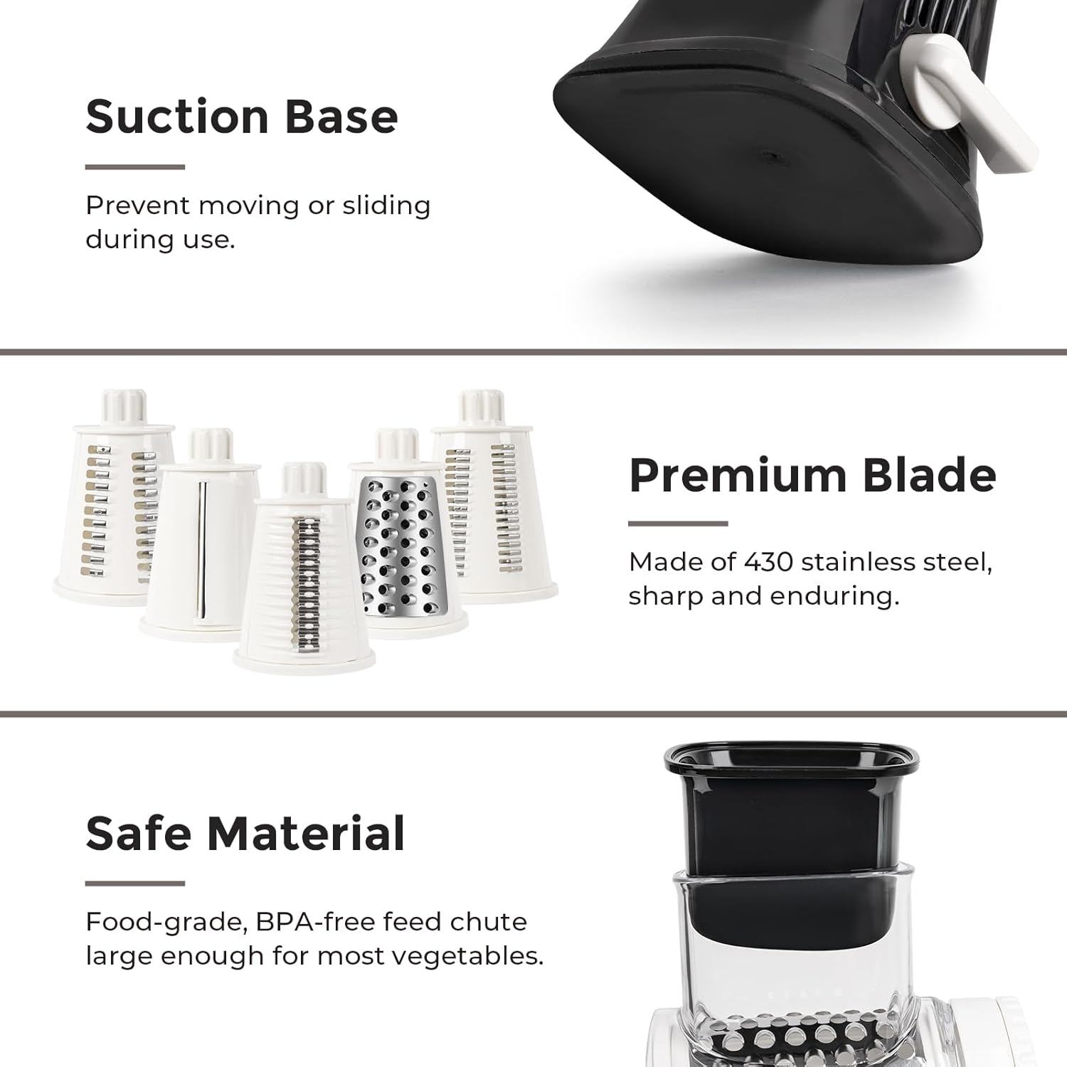 X Home 5-in-1 Rotary Cheese Grater for Kitchen, Upgraded Hand Crank Shredder with Stronger Suction Base & Multifunctional Drum Blades, for Cheese, Vegetables and Nuts, Easy to Use and Clean, Black