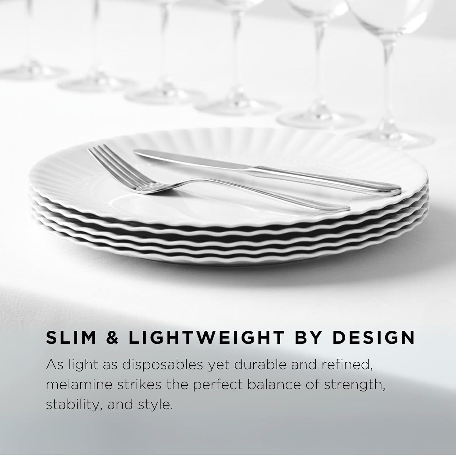 • Elegant Fluted Design: This plate set features a pure white tone with pleated edges, offering a ceramic-like look in durable, slim melamine — perfect for both everyday meals and special occasions.
