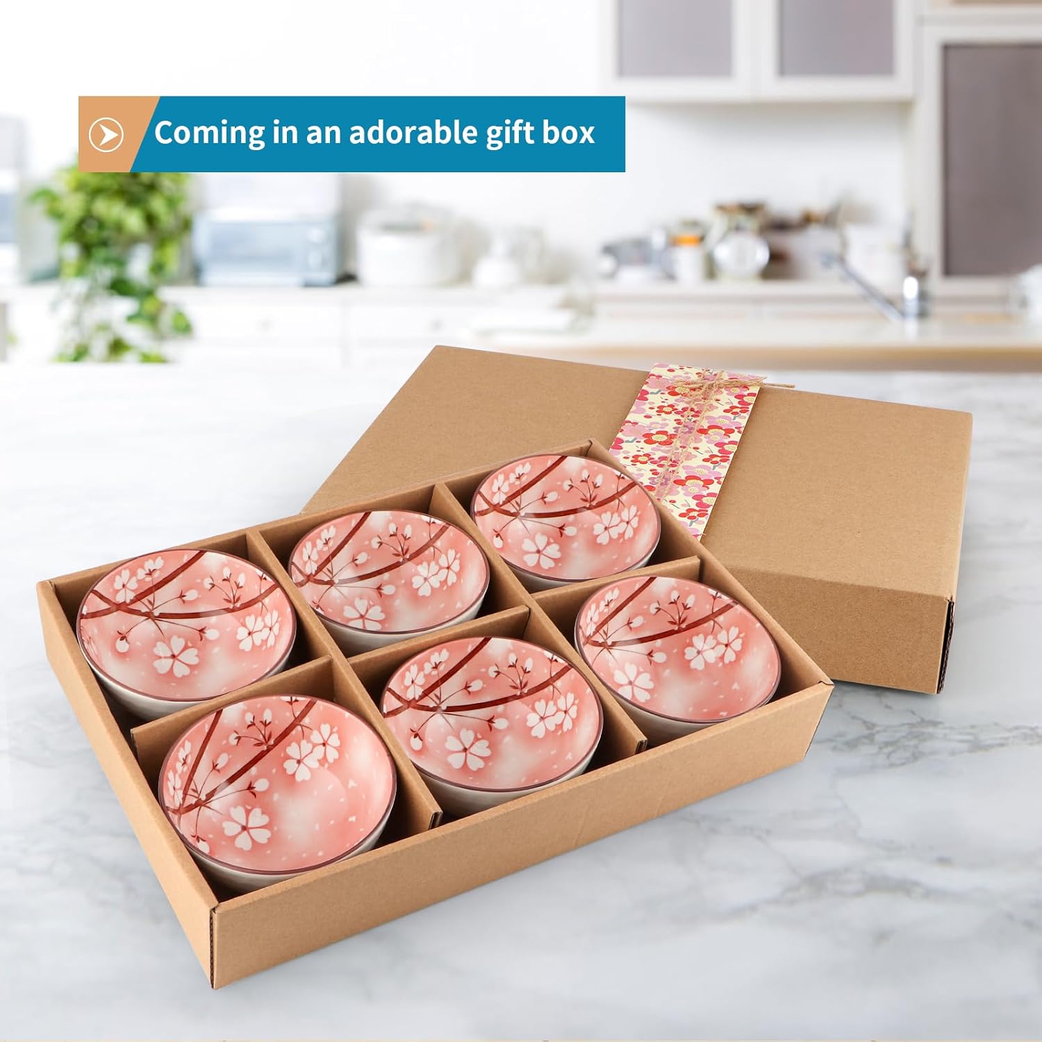 Ceramic Rice Bowls 10 oz, Sakura Bowl Gift Set, Dinnerware Serving Bowls for Rice, Cereal, Noodle, Soup, Desserts, Pack of 6 (Pink)