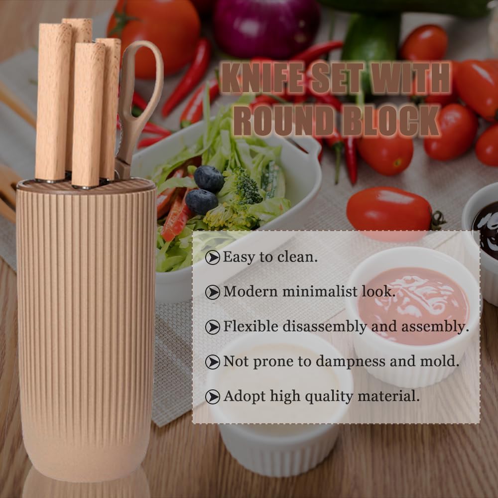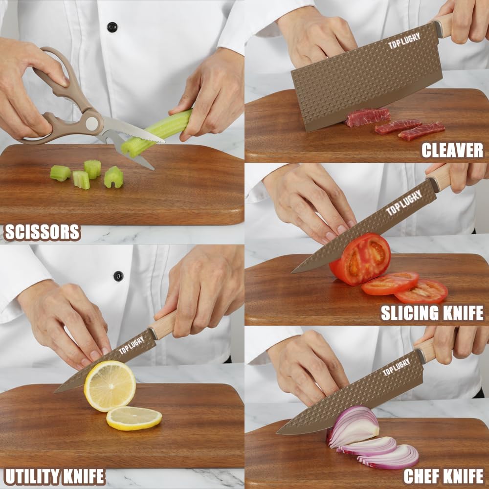 • Utility-driven Kitchen Knife Set: 6-Piece knife block set includes: 12" Kitchen Knife, 10" Chef's Knife, 9" Utility Knife, 8" Cleaver Meat Knife, 7.9" Kitchen Scissors, 9.3" Universal Knife Block which keep knives organized, neat, and space-saving
