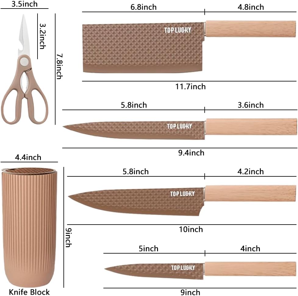 Knife Set, Wiztoynia 6-Piece Coffee Kitchen Knife Set for Home, Anti-Rust Non-stick Stainless Steel Sharp Chef Knife Set with Universal Knife Block for Kitchen, Ergonomical Design (Coffee)