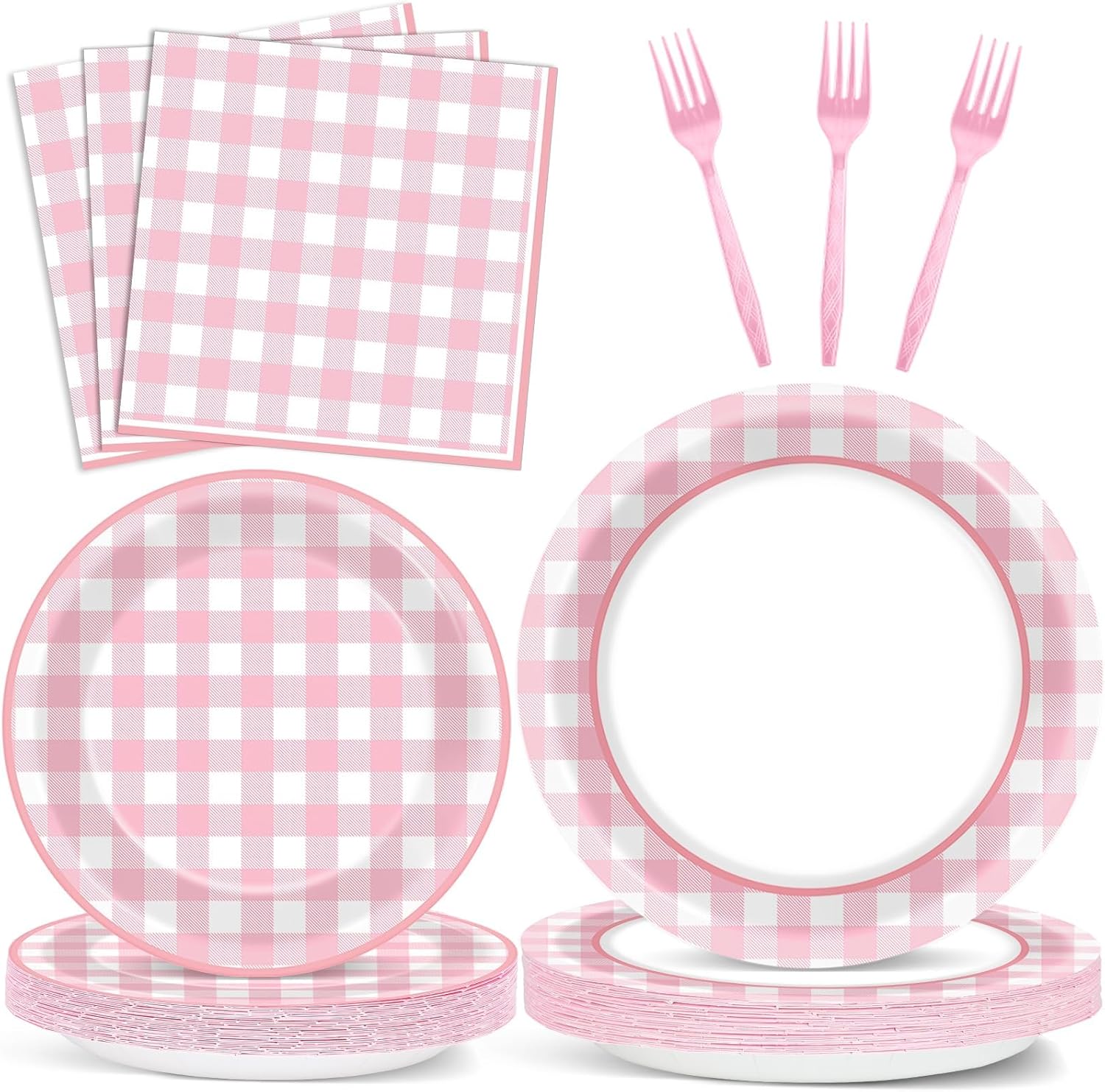 • Packing content: These pink and white gingham checkered plaid party tableware includes: 50 dinner plates (9 inch), 50 dessert plates (7 inch), 50 napkins (13 inch) and 50 forks, there is a total of 200 pieces in this set, which will suitable for 50 guests in your picnic birthday party.