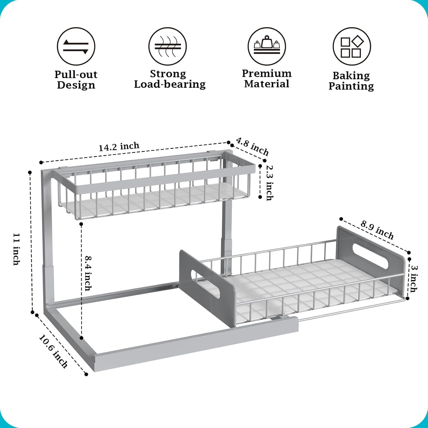 • Sliding Storage Drawer: The under sink organizer is designed as a sliding drawer with handles, can be pulled out smoothly, allowing you to easily access the items stored at the bottom.