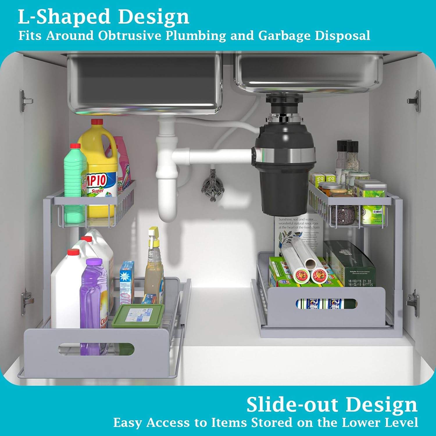 • L Shaped Design: L-shaped design with narrow top and wide bottom, leaves space for plumbing and garbage disposal, maximizing the vertical space of the sink. And the bottom tier leaves a suitable space for your tall bottles, which can solve your cabinet storage troubles.