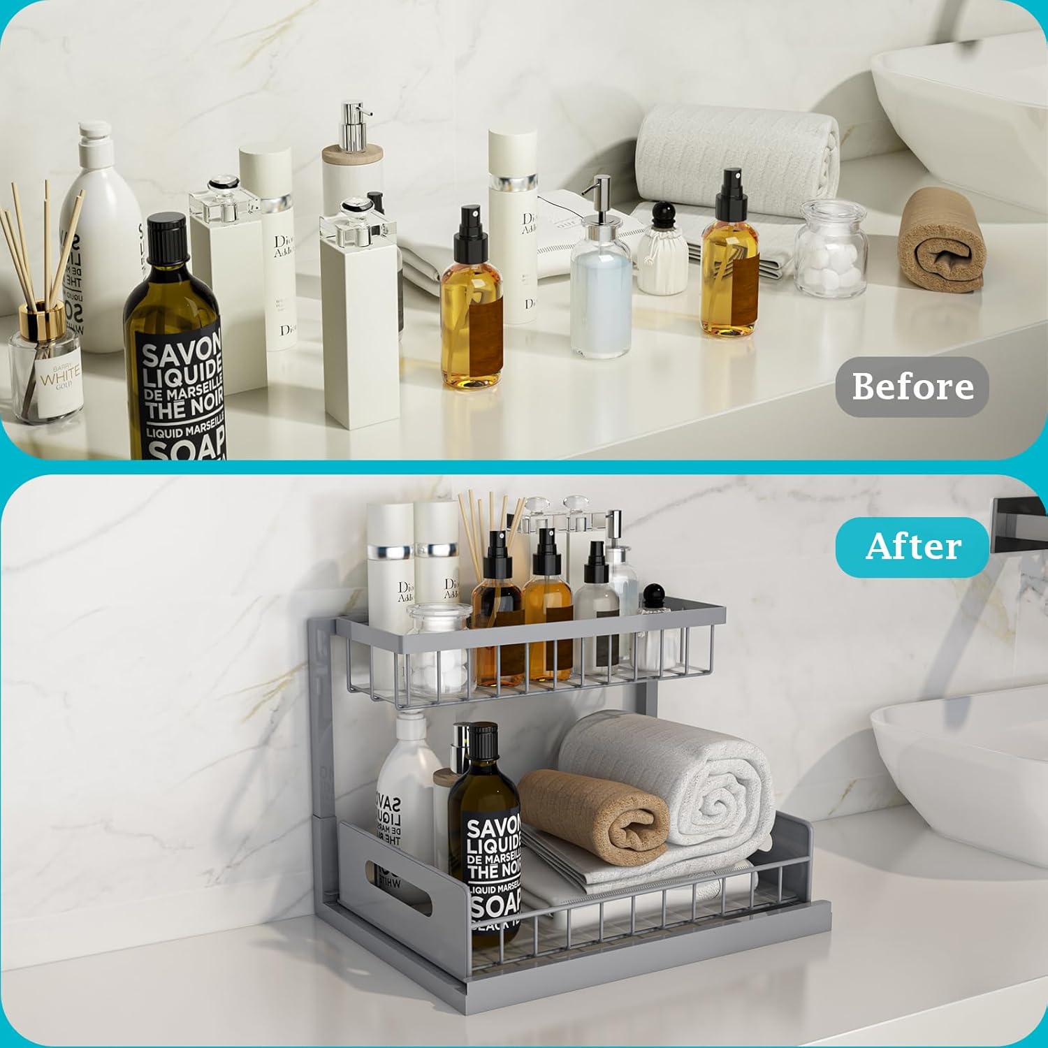 REALINN Under Sink Organizer, Pull Out Cabinet Organizer 2 Tier Slide Out Sink Shelf Cabinet Storage Shelves, Storage for Kitchen Bathroom, Grey, 2 Pack