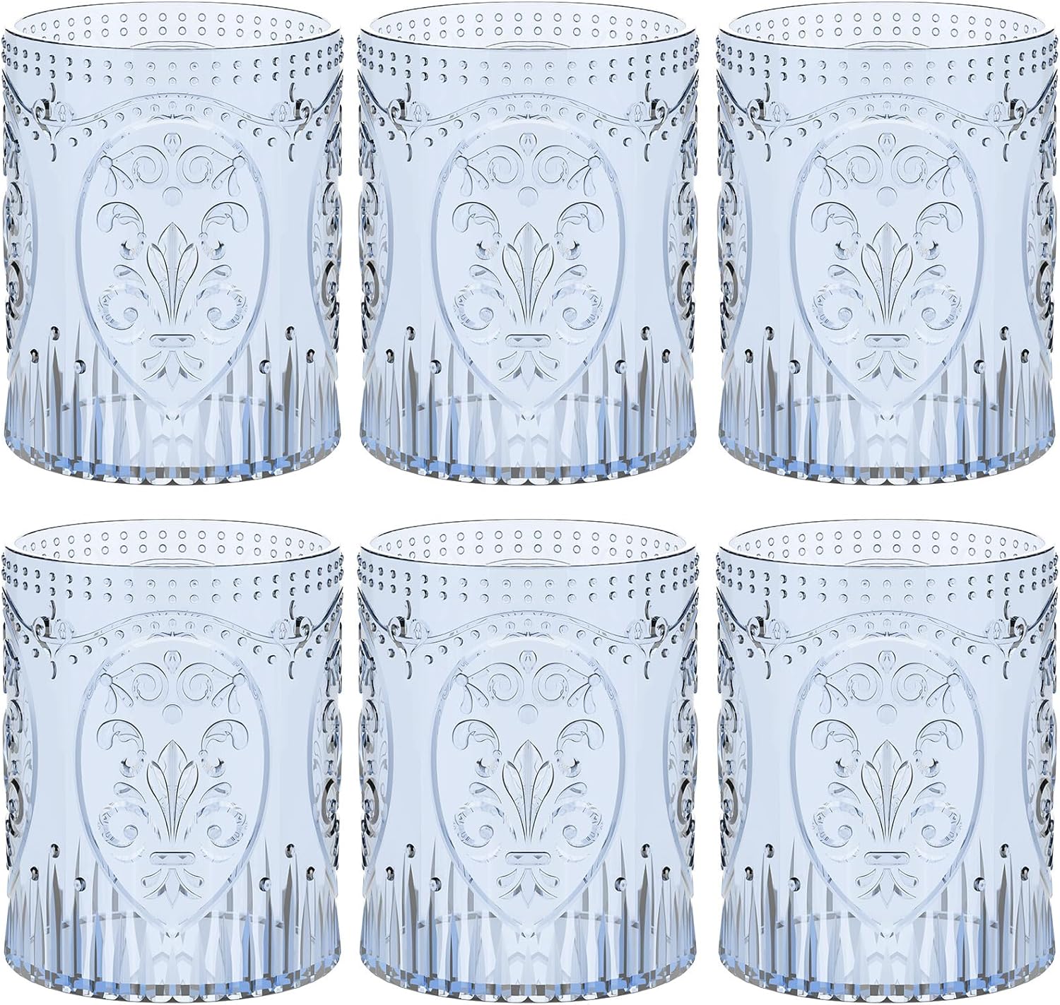 6 Plastic Vintage Drinking Glasses 8.5oz Stemless Retro Embossed Wine Glasses Shatterproof Reusable Cups for Baby Shower Wedding Reception Grand Event Party (Blue)