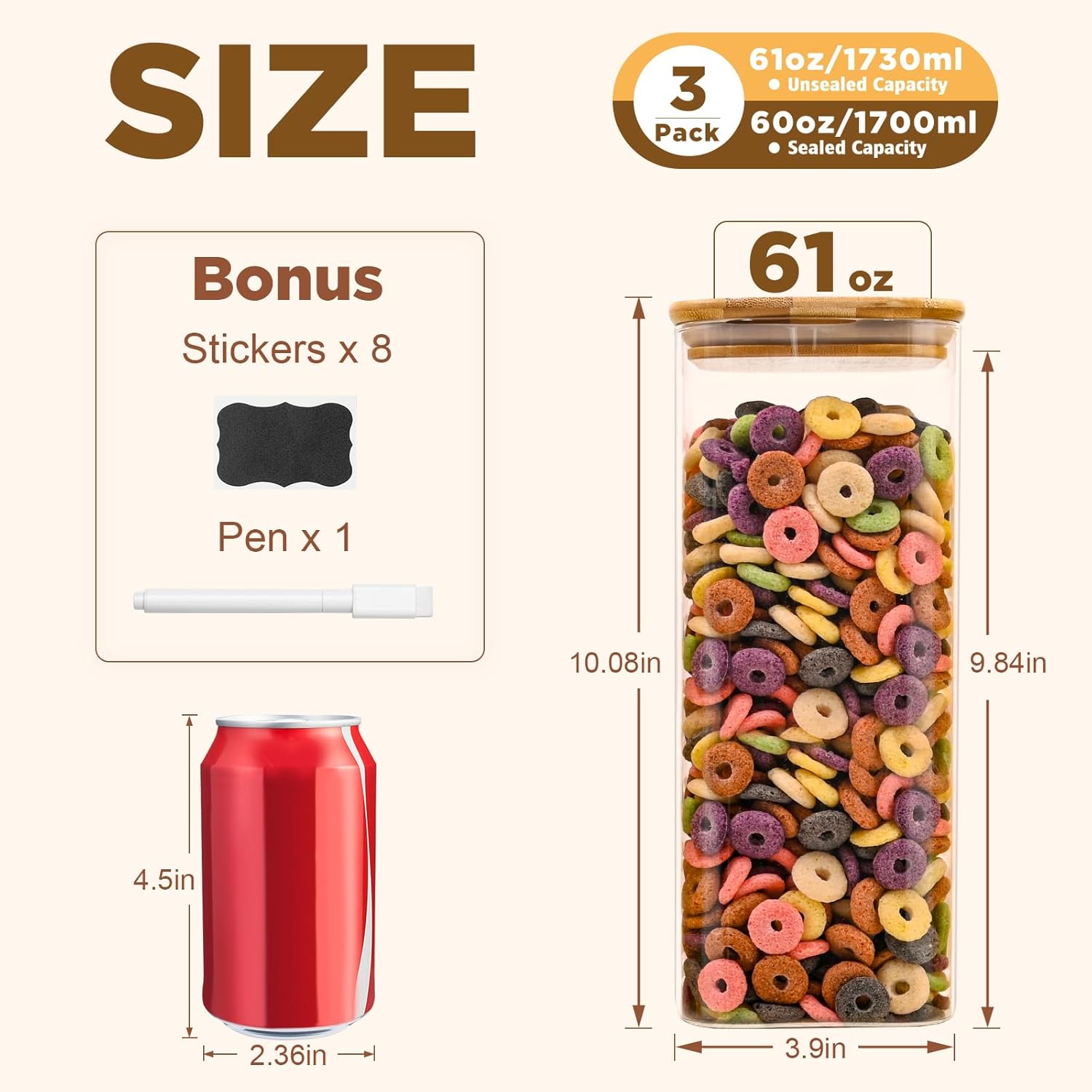 • [Product details] Square glass storage jar height:10.08in. Diameter:3.9in. Capacity:610oz(1730ml). Package contains: 3pcs. 3 pieces glass pantry storage containers with same volume meet you various storage need.