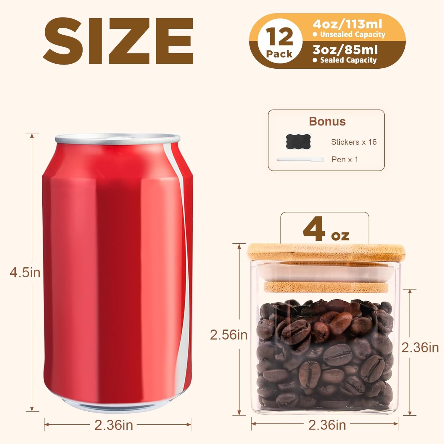 • [Product details] Square glass storage jar height:2.56in. Diameter:2.36in. Capacity:4oz(113ml). Package contains: 12pcs. 12 pieces glass pantry storage containers with same volume meet you various storage need.