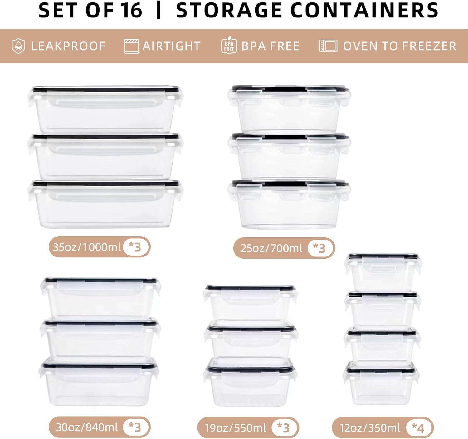 32 PCS Plastic Food Storage Containers with Lids Airtight, BPA-Free Leakproof Meal Prep Container Set for Kitchen Storage Reusable, Microwave Dishwasher Safe Stackable with Labels & Marker