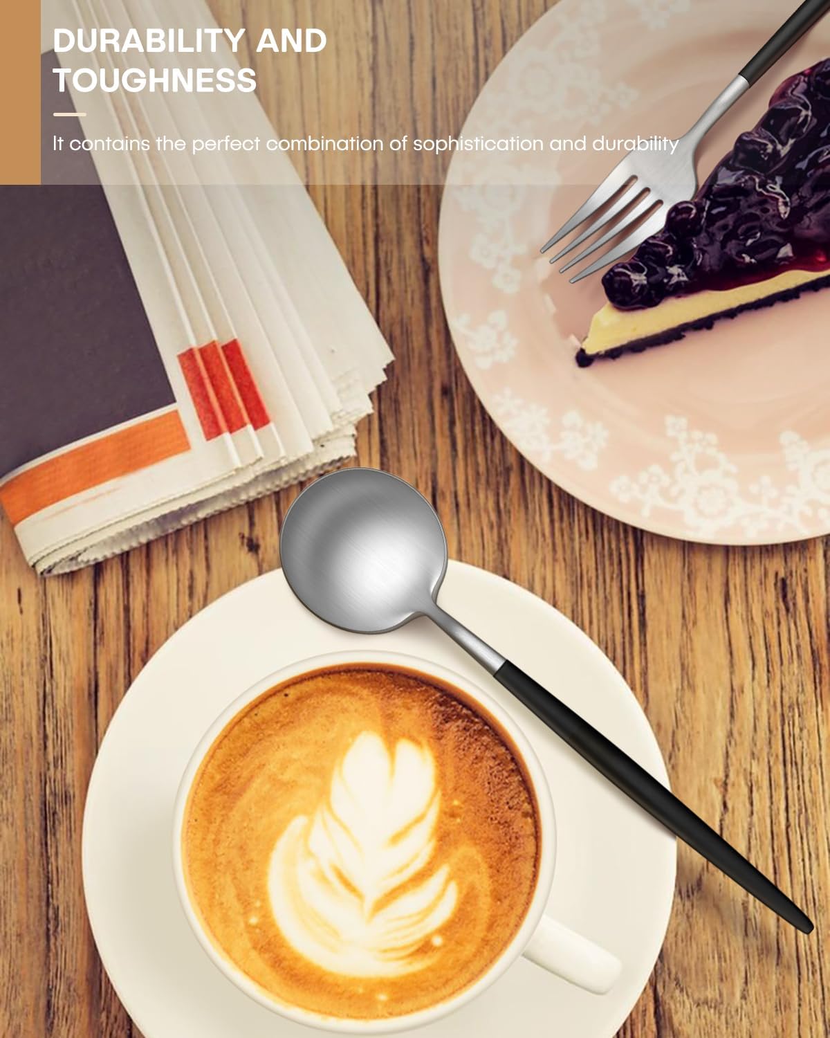 • 30-Piece Black and Silverware Sets for 6 with 6 Salad Forks,6 Dinner forks,6 Dinner Knives,6 Dinner Spoons and 6 Dessert Spoons. Use classic stain polished round flatware sets design especially adopt suitable ergonomic, you can enjoy more comfortable grip