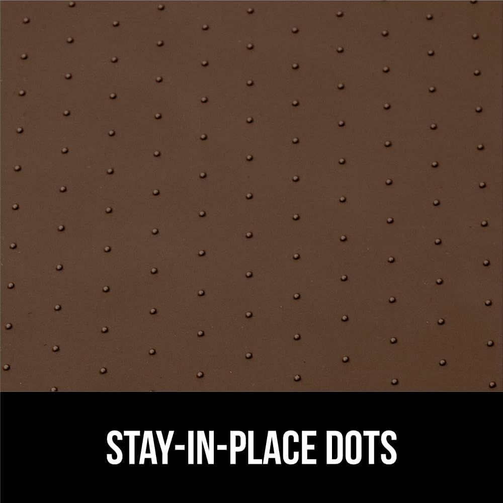 • STAYS IN PLACE: designed to lay flat and grip your cabinets, mat stays in place with daily use taking items in and out; raised silicone dots on the topside help prevent items from slipping and sliding around the mat