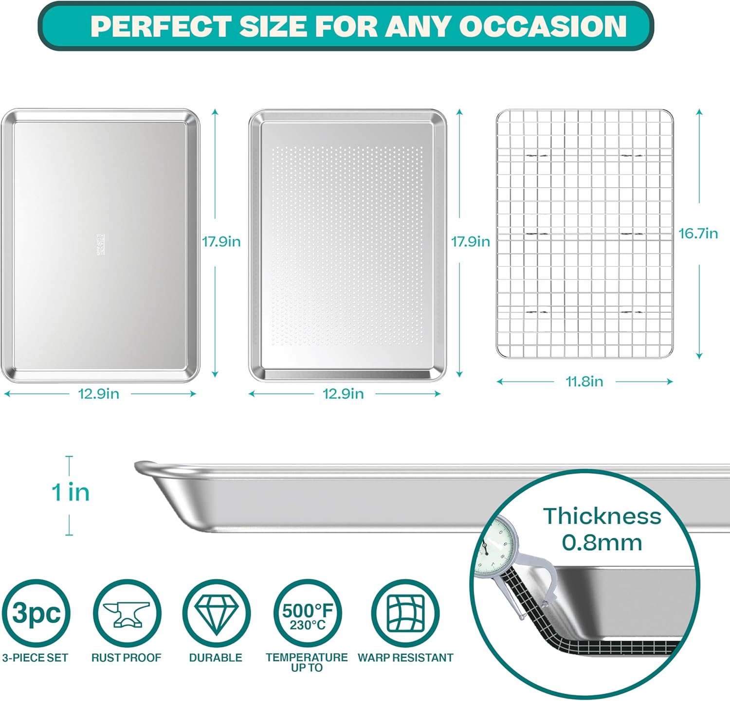 • ✔️This set contains 3pcs - 1pc 17.9"x12.9" Aluminum Half sheet, 1pc 17.9"x12.9" Perforated Aluminum Half sheet, and 1pc 16.7"x11.8" Stainless steel Heating Cooling Baking Rack Grid. No chemicals added. Safe for baking at 450℉. Baker's Secret team is available for inquiry 24/7. Non Toxic PTFE,PFAS,PFOA Free.
