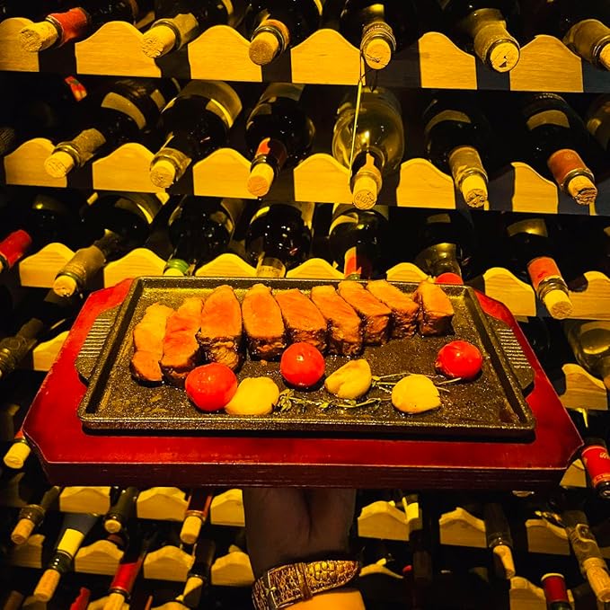 Cast Iron Steak Plate, Grill Pans, Sizzle Griddle with Wooden Base, Steak Pan, Griddle Grill Pan with handles (Plate with Base 7.5" x 4.8")