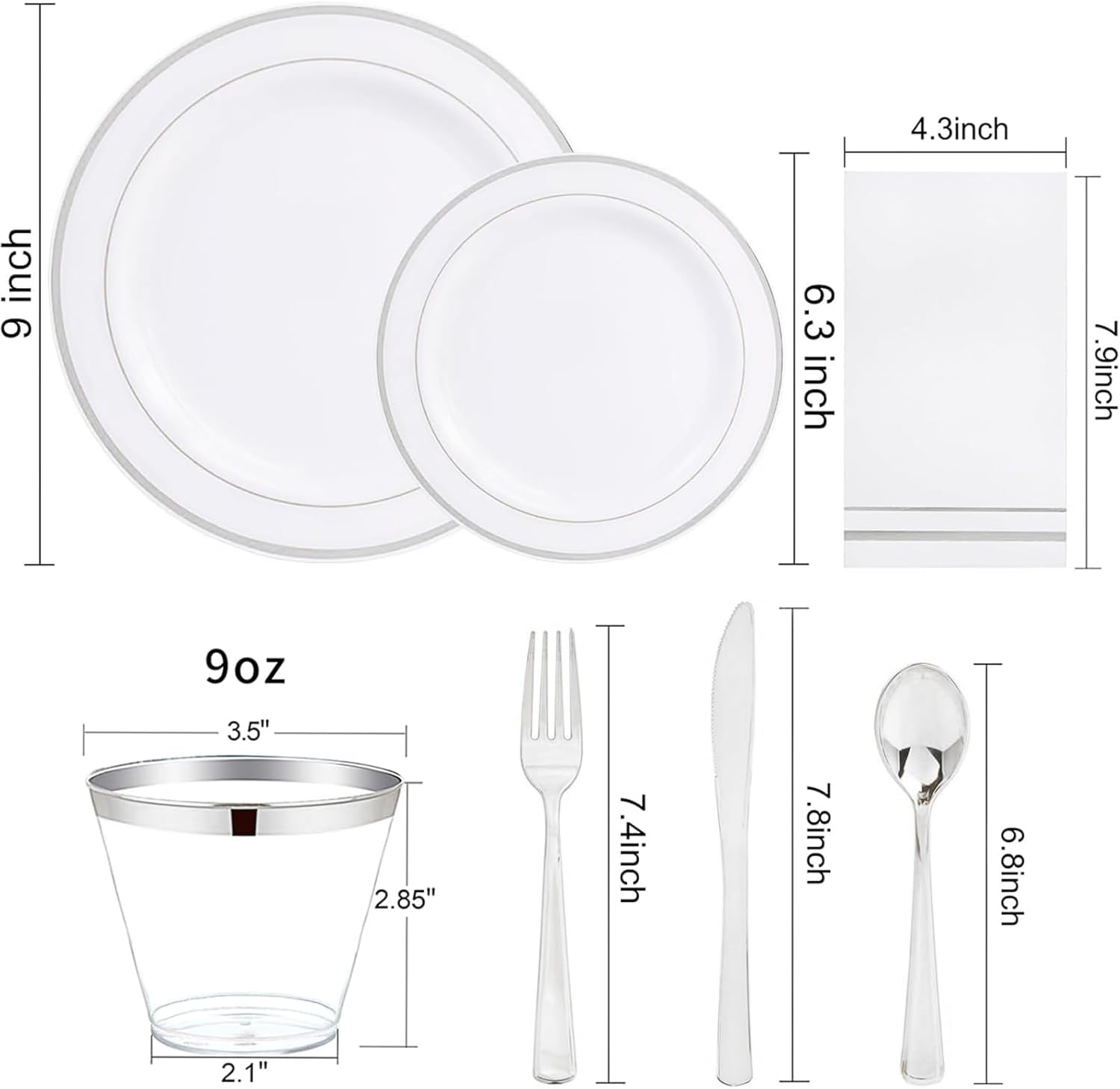• SAVE TIME - Our silver plates help you save time. You can throw away the dirty plates directly after the dinner party to spend more time with family and friends. You can also wash them and use white and silver disposable plates again.