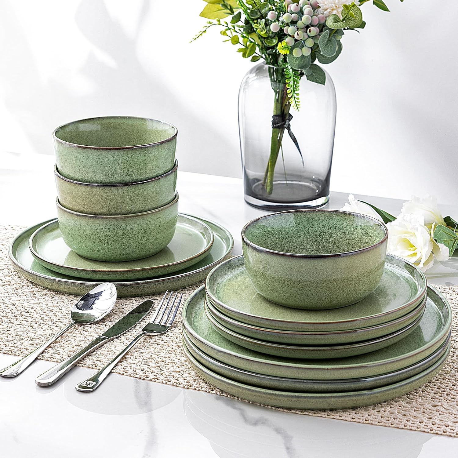 GBHOME Ceramic Dinnerware Sets for 6, 18 Pieces Stoneware Plates and Bowls Sets, Scratch Resistant Dishes, Dishwasher & Microwave Safe-Pastel Green